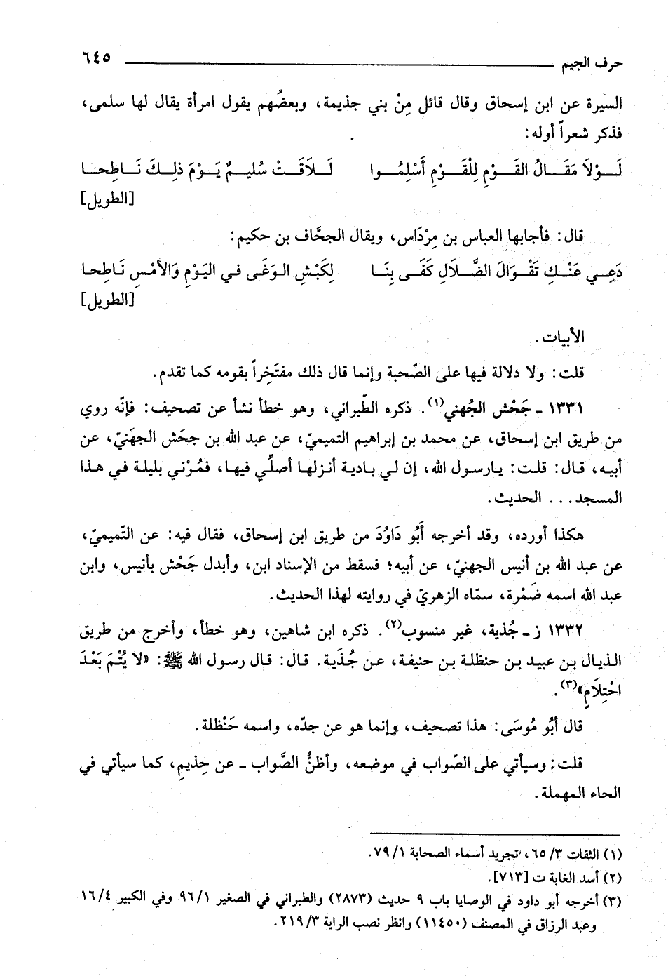 ذكره الطّبراني، وهو خطأ نشأ عن تصحيف: فإنّه روي من طريق ابن إسحاق، عن محمد بن إبراهيم التميميّ، عن عبد اللَّه بن جحش الجهنيّ، عن أبيه، قال: قلت: يا رسول اللَّه، إن لي بادية أنزلها أصلّي فيها، فمرني بليلة في هذا المسجد ... الحديث.