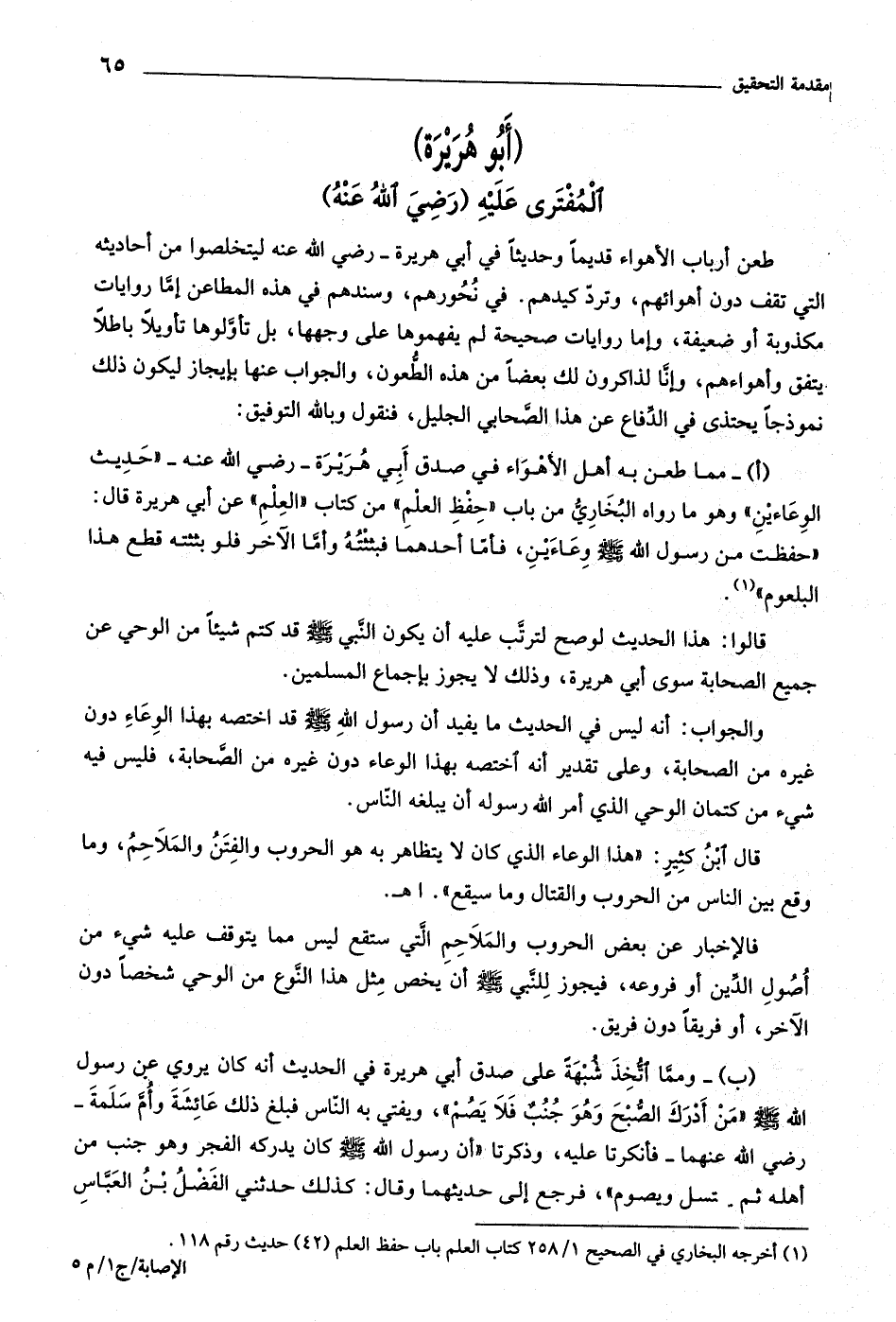(أ) - مما طعن به أهل الأهواء في صدق أبي هريرة- رضي اللَّه عنه- «حديث الوعاءين» وهو ما رواه البخاريّ من باب «حفظ العلم» من كتاب «العلم» عن أبي هريرة قال: