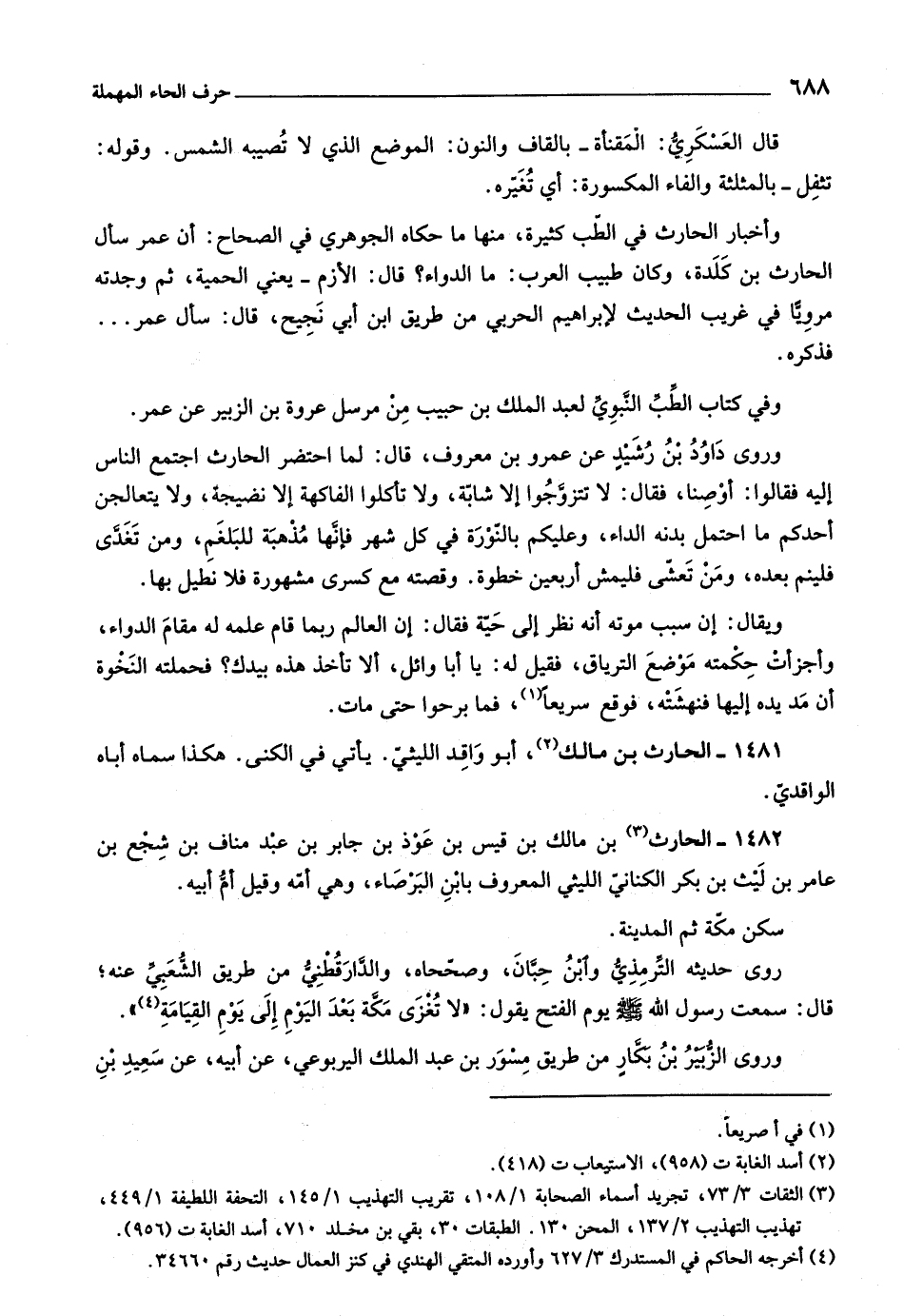 وأخبار الحارث في الطّب كثيرة، منها ما حكاه الجوهري في الصحاح: أن عمر سأل الحارث بن كلدة، وكان طبيب العرب: ما الدواء؟ قال: الأزم- يعني الحمية، ثم وجدته مرويّا في غريب الحديث لإبراهيم الحربي من طريق ابن أبي نجيح، قال: سأل عمر ...