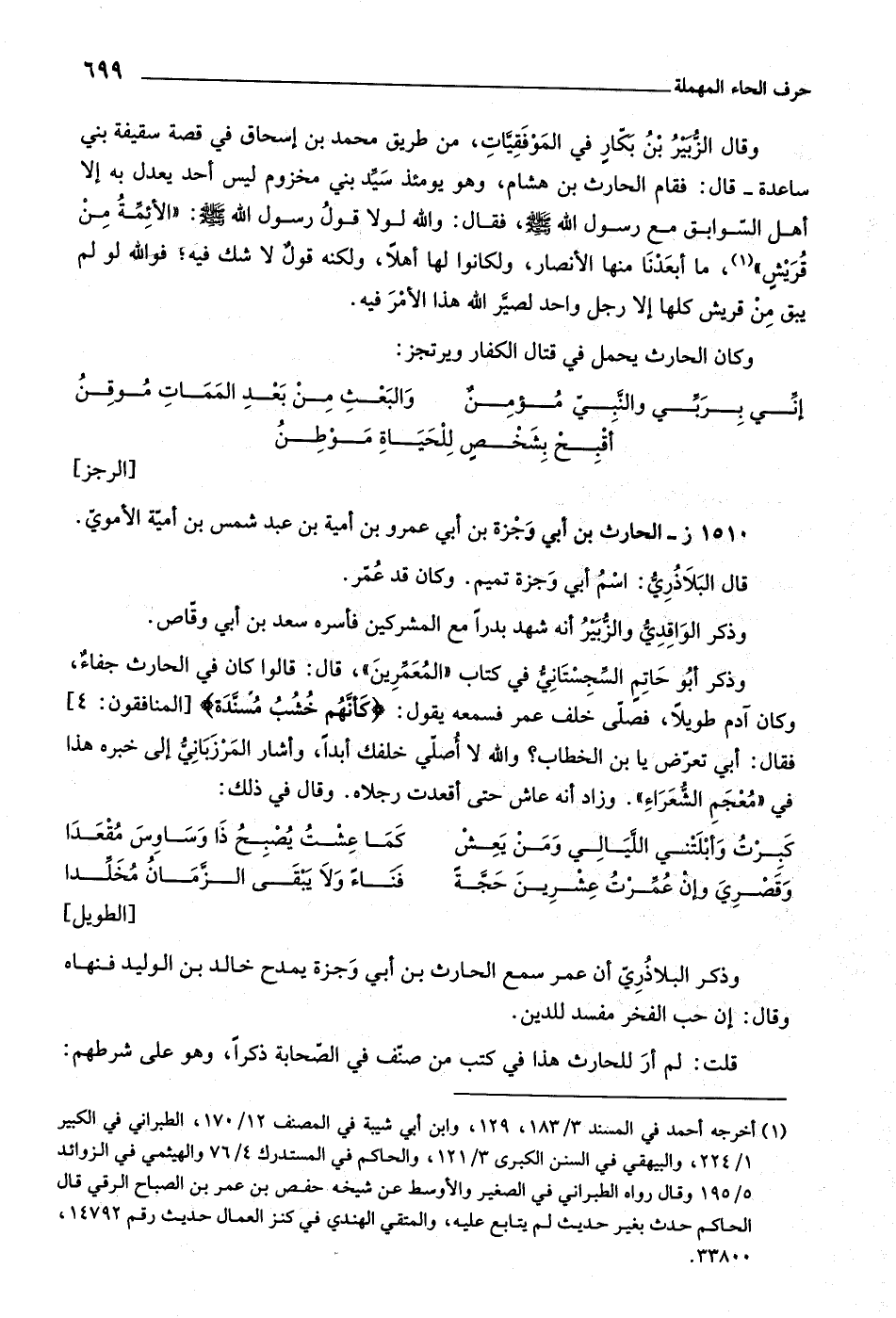 وقال الزّبير بن بكّار في الموفقيّات، من طريق محمد بن إسحاق في قصة سقيفة بني ساعدة- قال: فقام الحارث بن هشام، وهو يومئذ سيّد بني مخزوم ليس أحد يعدل به إلا أهل السّوابق مع رسول اللَّه صلى اللَّه عليه وسلم، فقال: واللَّه لولا قول رسول اللَّه صلى اللَّه عليه وسلم: «الأئمّة من قريش» [ (١) ] ، ما أبعدنا منها الأنصار، ولكانوا لها أهلا، ولكنه قول لا شك فيه، فو اللَّه لو لم يبق من قريش كلها إلا رجل واحد لصيّر اللَّه هذا الأمر فيه.