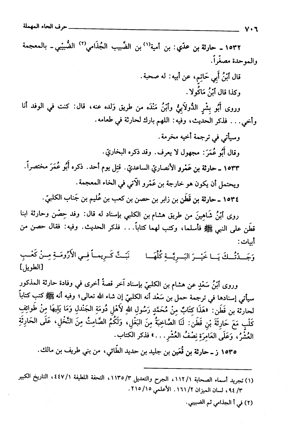 [الطويل] وروى ابن سعد عن هشام بن الكلبيّ بإسناد آخر قصة أخرى في وفادة حارثة المذكور سيأتي إسنادها في ترجمة حمل بن سعد أنه الكلبيّ إن شاء اللَّه تعالى، وفيه