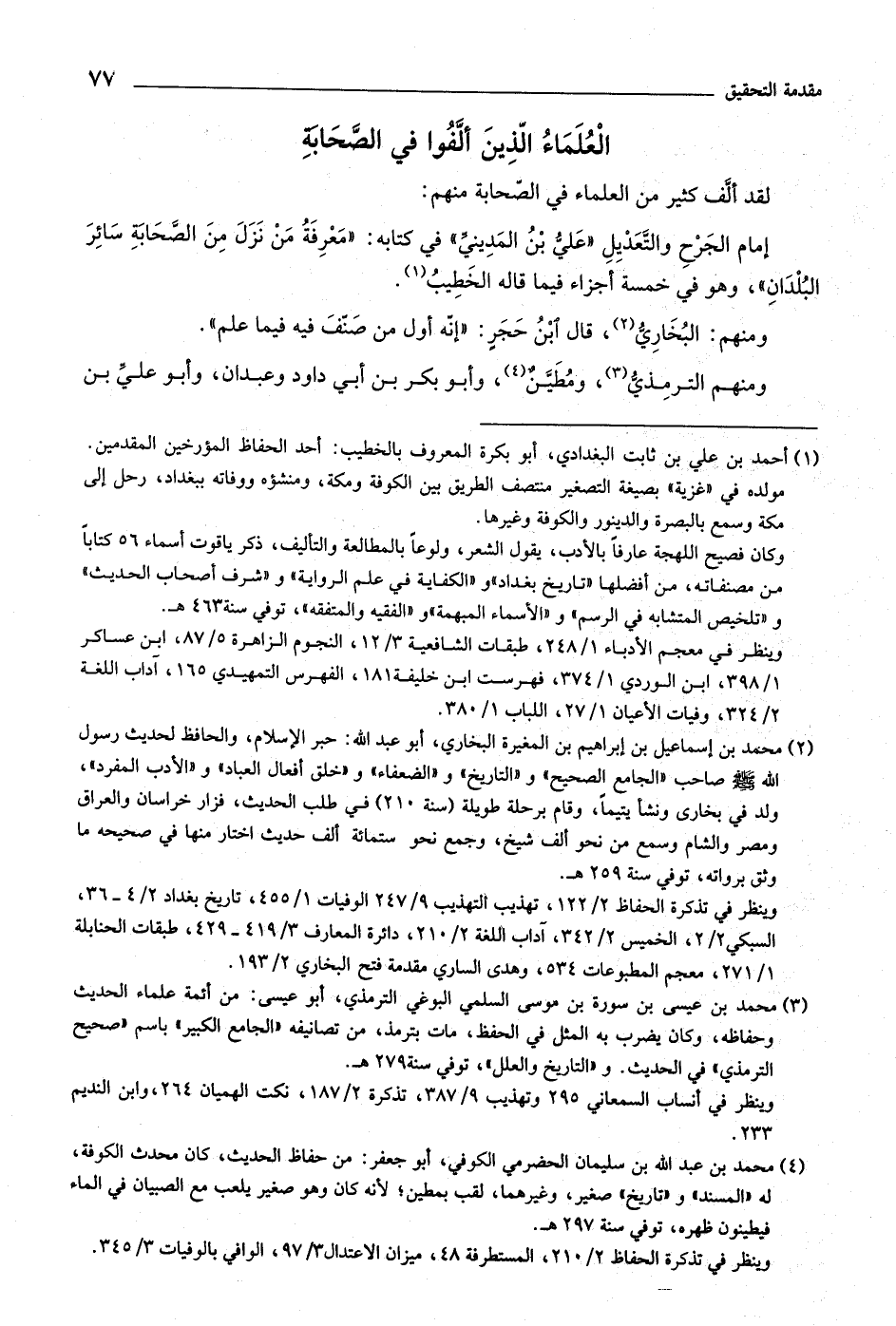 [ (٢) ] محمد بن إسماعيل بن إبراهيم بن المغيرة البخاري، أبو عبد اللَّه: حبر الإسلام، والحافظ لحديث رسول اللَّه صلّى اللَّه عليه وسلم صاحب «الجامع الصحيح» و «التاريخ» و «الضعفاء» و «خلق أفعال العباد» و «الأدب المفرد» ، ولد في بخارى ونشأ يتيما، وقام برحلة طويلة (سنة ٢١٠) في طلب الحديث، فزار خراسان والعراق ومصر والشام وسمع من نحو ألف شيخ، وجمع نحو ستمائة ألف حديث اختار منها في صحيحه ما وثق برواته، توفي سنة ٢٥٩ هـ.