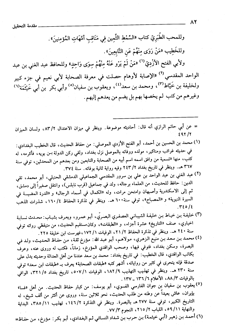 [ (٤) ] محمد بن سعد بن منيع الزهري، مولاهم، أبو عبد اللَّه: مؤرخ ثقة، من حفاظ الحديث، ولد في البصرة، وسكن بغداد، فتوفي فيها، وصحب الواقدي المؤرخ، زمانا، فكتب له وروى عنه، وعرف بكاتب الواقدي، قال الخطيب: في تاريخ بغداد: محمد بن سعد عندنا من أهل العدالة وحديثه يدل على صدقة فإنه يتحرى في كثير من رواياته، أشهر كتبه «طبقات الصحابة» يعرف ب «طبقات ابن سعد» توفي سنة ٢٣٠ هـ. وينظر في تهذيب التهذيب ٩/ ١٨٢، الوفيات ١/ ٥٠٧، تاريخ بغداد ٥/ ٣٢١، الوافي بالوفيات ٣/ ٨٨، الأعلام ٦/ ١٣٦- ١٣٧.