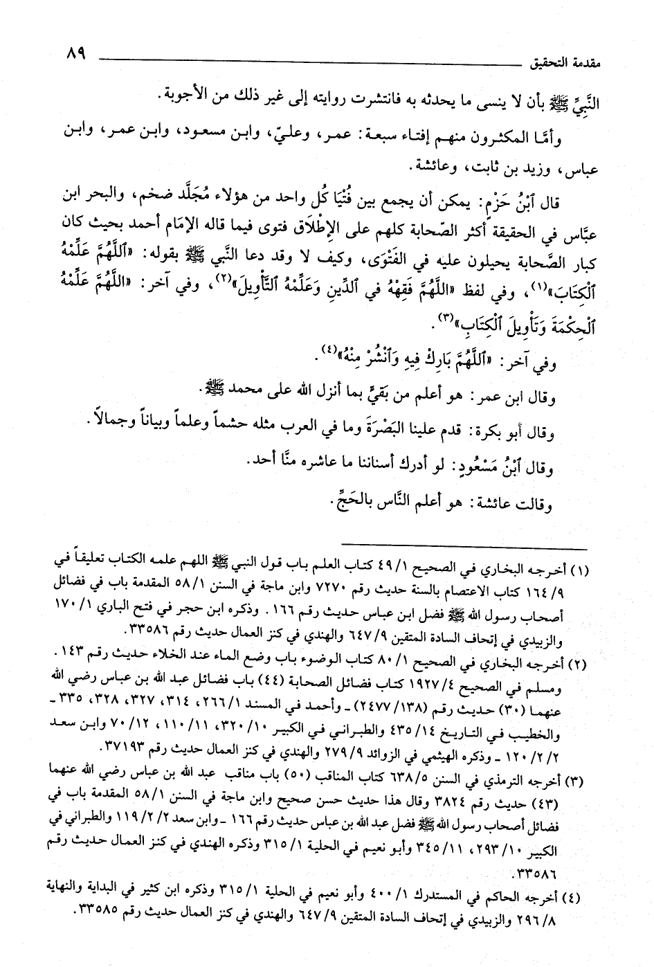 [ (٣) ] أخرجه الترمذي في السنن ٥/ ٦٣٨ كتاب المناقب (٥٠) باب مناقب عبد اللَّه بن عباس رضي اللَّه عنهما (٤٣) حديث رقم ٣٨٢٤ وقال هذا حديث حسن صحيح وابن ماجة في السنن ١/ ٥٨ المقدمة باب في فضائل أصحاب رسول اللَّه صلّى اللَّه عليه وسلم فضل عبد اللَّه بن عباس حديث رقم ١٦٦- وابن سعد ٢/ ٢/ ١١٩ والطبراني في الكبير ١٠/ ٢٩٣، ١١/ ٣٤٥ وأبو نعيم في الحلية ١/ ٣١٥ وذكره الهندي في كنز العمال حديث رقم ٣٣٥٨٦.