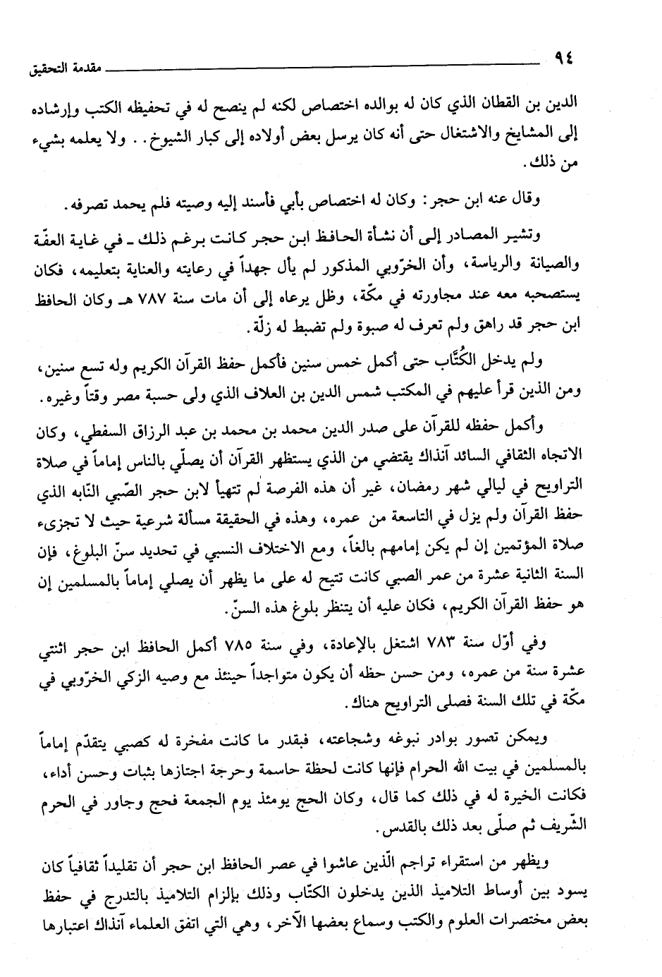 وتشير المصادر إلى أن نشأة الحافظ ابن حجر كانت برغم ذلك- في غاية العفّة والصيانة والرئاسة، وأن الخرّوبي المذكور لم يأل جهدا في رعايته والعناية بتعليمه، فكان يستصحبه معه عند مجاورته في مكّة، وظل يرعاه إلى أن مات سنة ٧٨٧ هـ وكان الحافظ ابن حجر قد راهق ولم تعرف له صبوة ولم تضبط له زلّة.