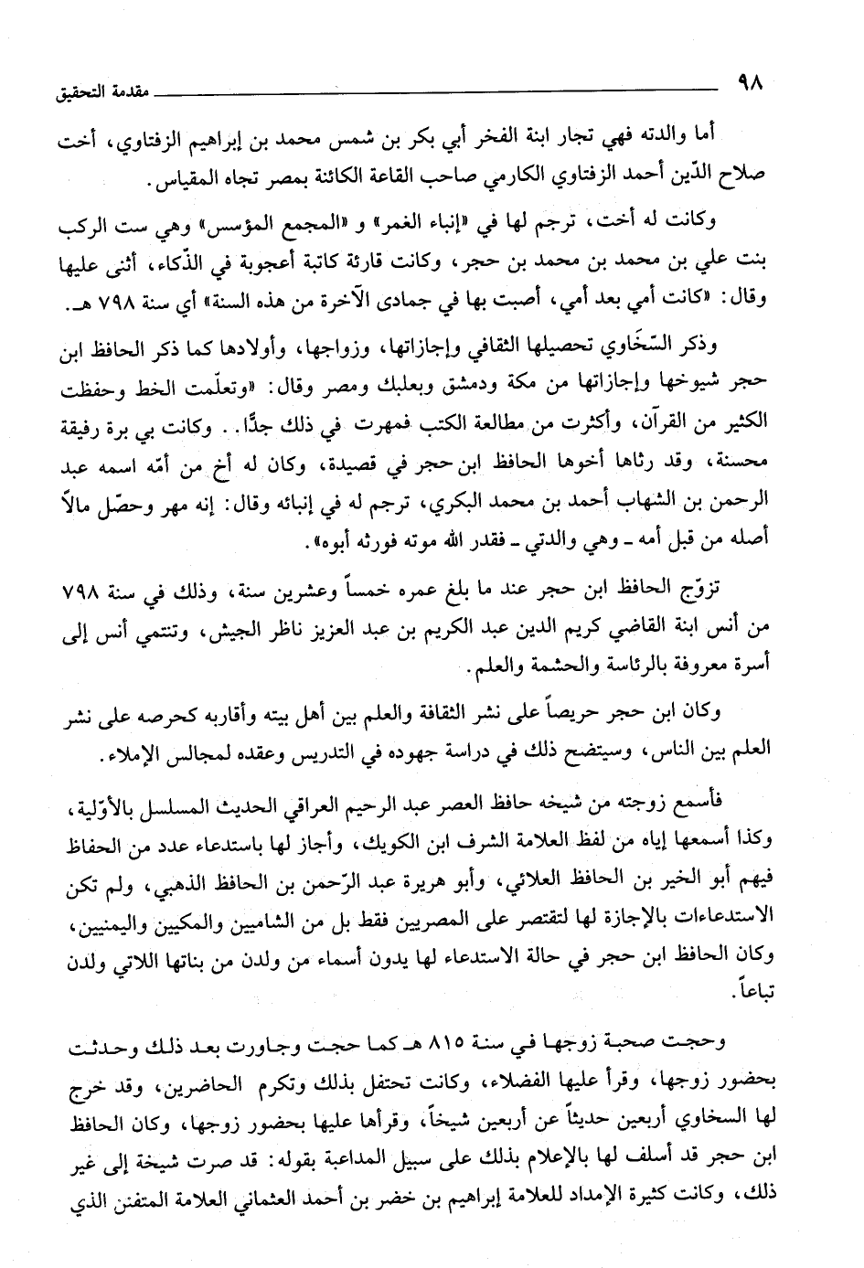 وذكر السّخاوي تحصيلها الثقافي وإجازاتها، وزواجها، وأولادها كما ذكر الحافظ ابن حجر شيوخها وإجازاتها من مكة ودمشق وبعلبكّ ومصر وقال: «وتعلّمت الخط وحفظت الكثير من القرآن، وأكثرت من مطالعة الكتب فمهرت في ذلك جدّا.. وكانت بي برة رفيقة محسنة، وقد رثاها أخوها الحافظ ابن حجر في قصيدة، وكان له أخ من أمّه اسمه عبد الرحمن بن الشهاب أحمد بن محمد البكري، ترجم له في إنبائه وقال: إنه مهر وحصّل مالا أصله من قبل أمه- وهي والدتي- فقدر اللَّه موته فورثه أبوه» .