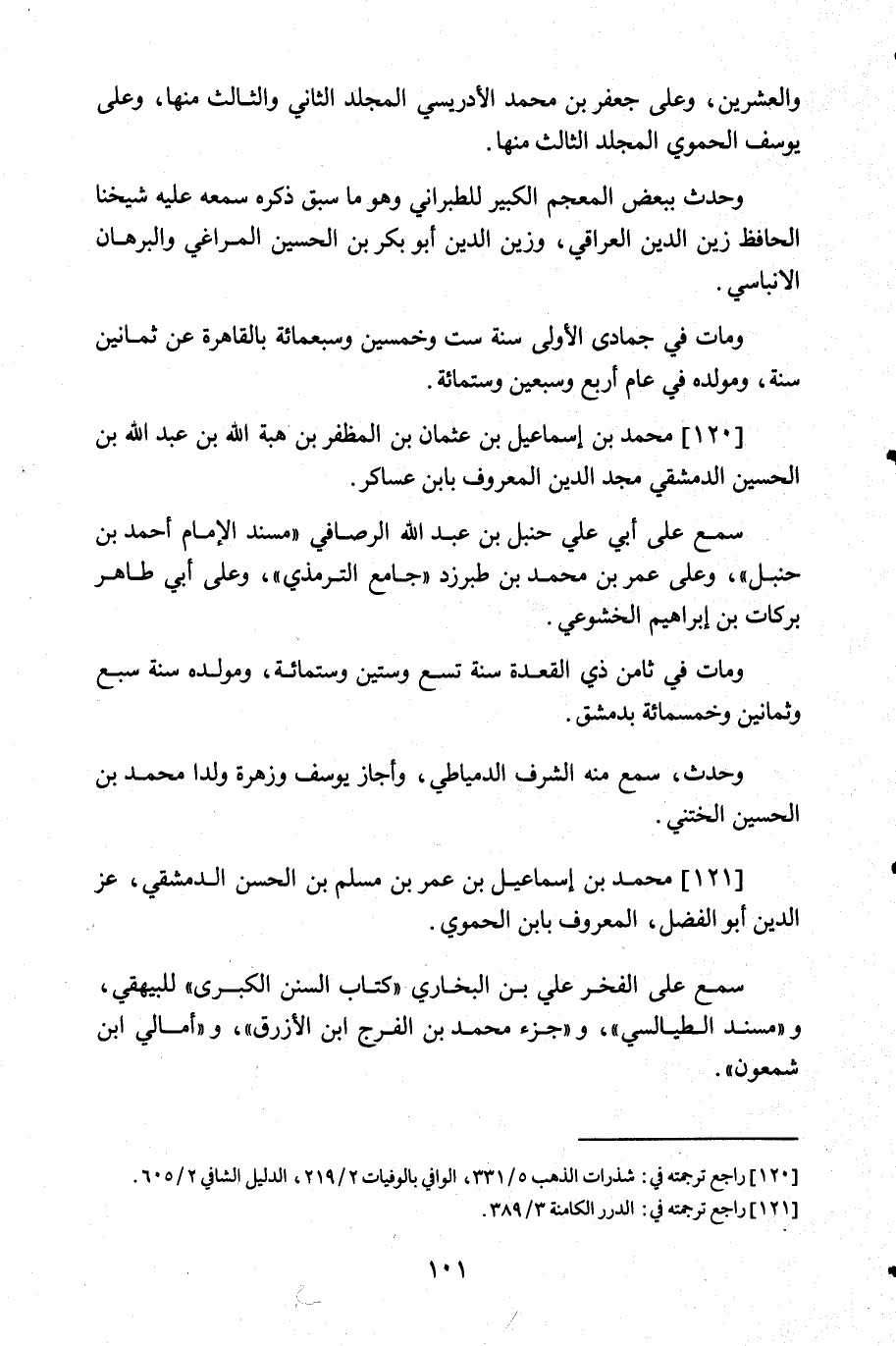 120- محمد بن اسماعيل بن عثمان بن المظفر بن هبة الله بن عبد الله بن الحسين الدمشقي مجد الدين المعروف بابن عساكر.
