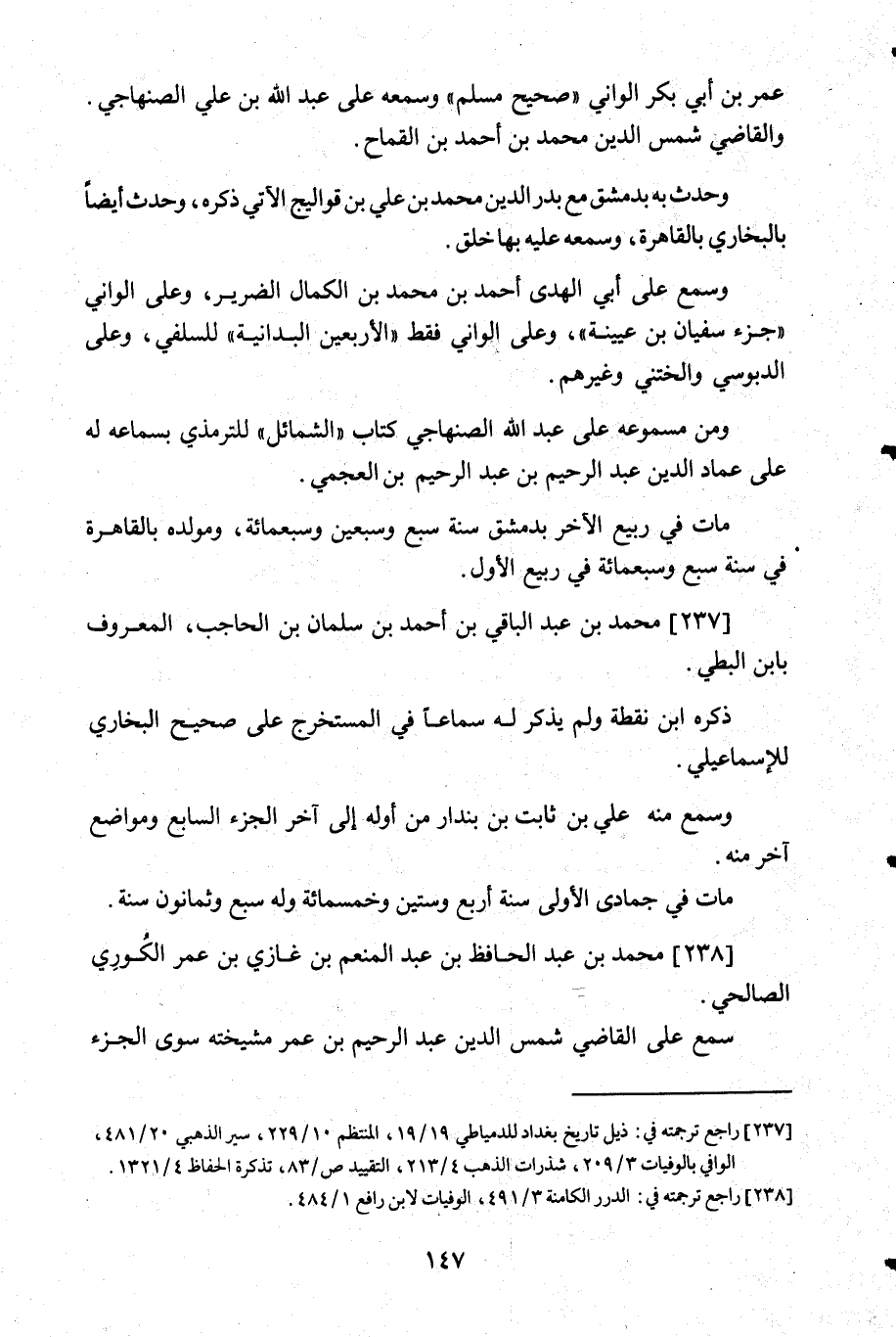 237- راجع ترجمته في: ذيل تاريخ بغداد للدمياطي 19/19, المنتظم 10/229, سير الذهبي 20/481, الوافي بالوفيات 3/209, شذرات الذهب 4/213, التقييد ص 83. تذكرة الحفاظ 4/1321.