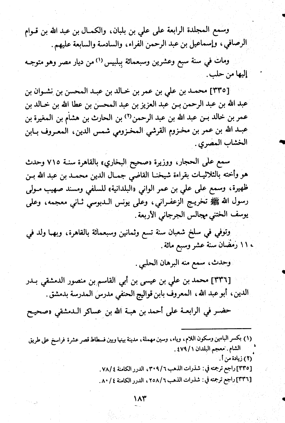 335- محمد بن علي بن عمر بن خالد بن عبد المحسن بن نشوان بن عبد الله بن عبد الرحمن بن عبد العزيز بن عبد المحسن بن عطا الله بن خالد بن عمر بن خالد بن عبد الله بن عبد الرحمن2 بن الحارث بن هشام بن المغيرة بن عبد الله بن عمر بن مخزوم القرشي المخزومي شمس الدين المعروف بابن الخشاب المصري.