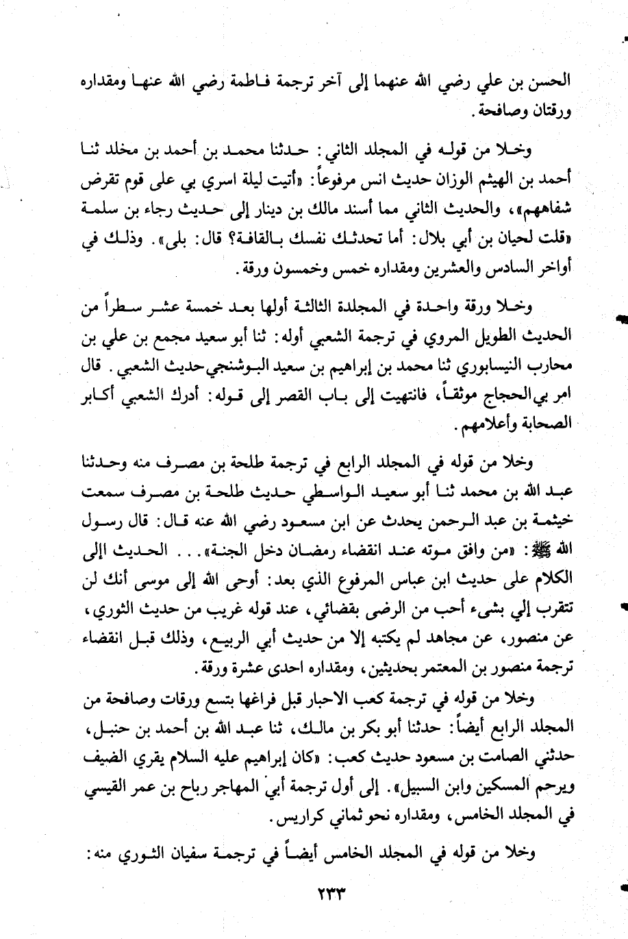وخلا ورقة واحدة في المجلدة الثالثة أولها بعد خمسة عشر سطرا من الحديث الطويل المروي في ترجمة الشعبي أوله ثنا أبو سعيد مجمع بن علي بن محارب النيسابوري ثنا محمد بن ابراهيم بن سعيد البوشنجي حديث الشعبي قال امر بي الحجاج موثقا فانتهيت الى باب القصر الى قوله أدرك الشعبي أكابر الصحابة وأعلامهم.
