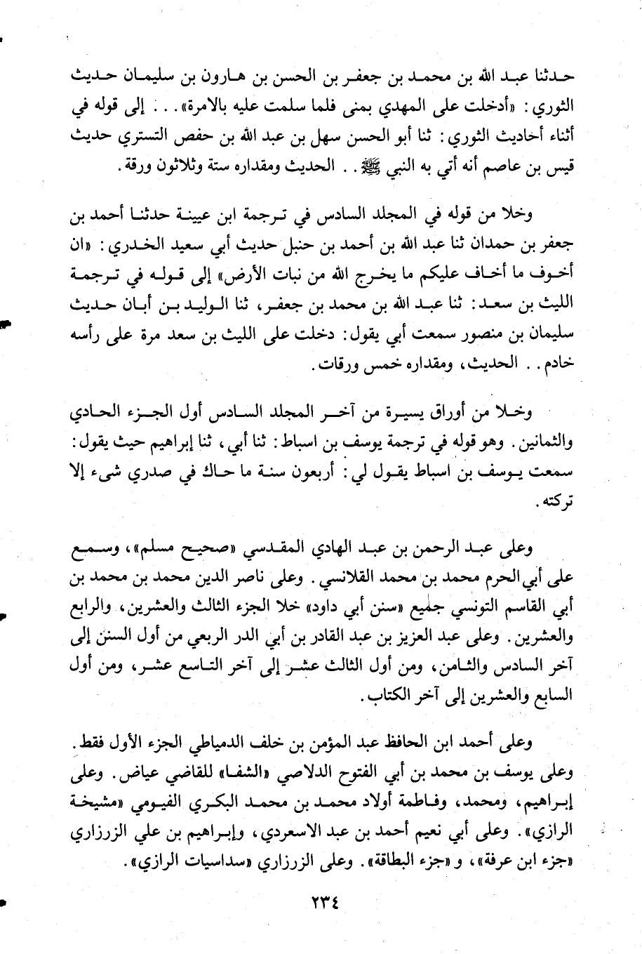 وخلا من قوله في المجلد السادس في ترجمة ابن عيينة حدثنا أحمد بن جعفر بن حمدان ثنا عبد الله بن أحمد بن حنبل حديث أبي سعيد الخدري ان أخوف ما أخاف عليكم ما يخرج الله من نبات الأرض الى قوله في ترجمة الليث بن سعد ثنا عبد الله بن محمد بن جعفر ثنا الوليد بن أبان حديث سليمان بن منصور سمعت أبي يقول دخلت على الليث بن سعد مرة عل راسه خادم الحديث ومقداره خمس ورقات.