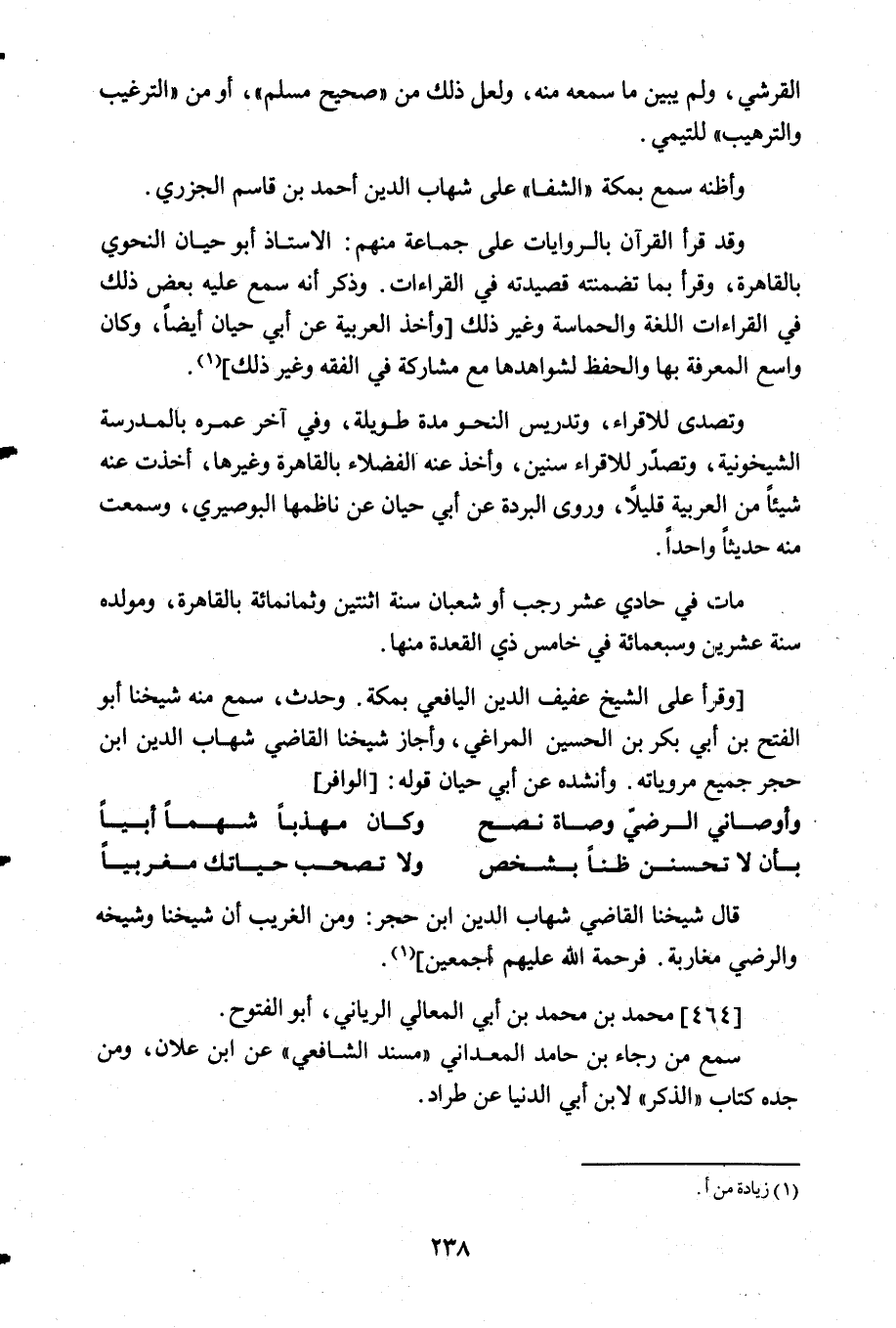 وقرأ عل الشيخ عفيف الدين اليافعي بمكة وحدث سمع منه شيخنا أبو الفتح بن أبي بكر بن الحسين المراغي وأجاز شيخا القاضي شهاب الدين ابن حجر جميع مروياته وأنشده عن أبي حيان قوله الوافر: