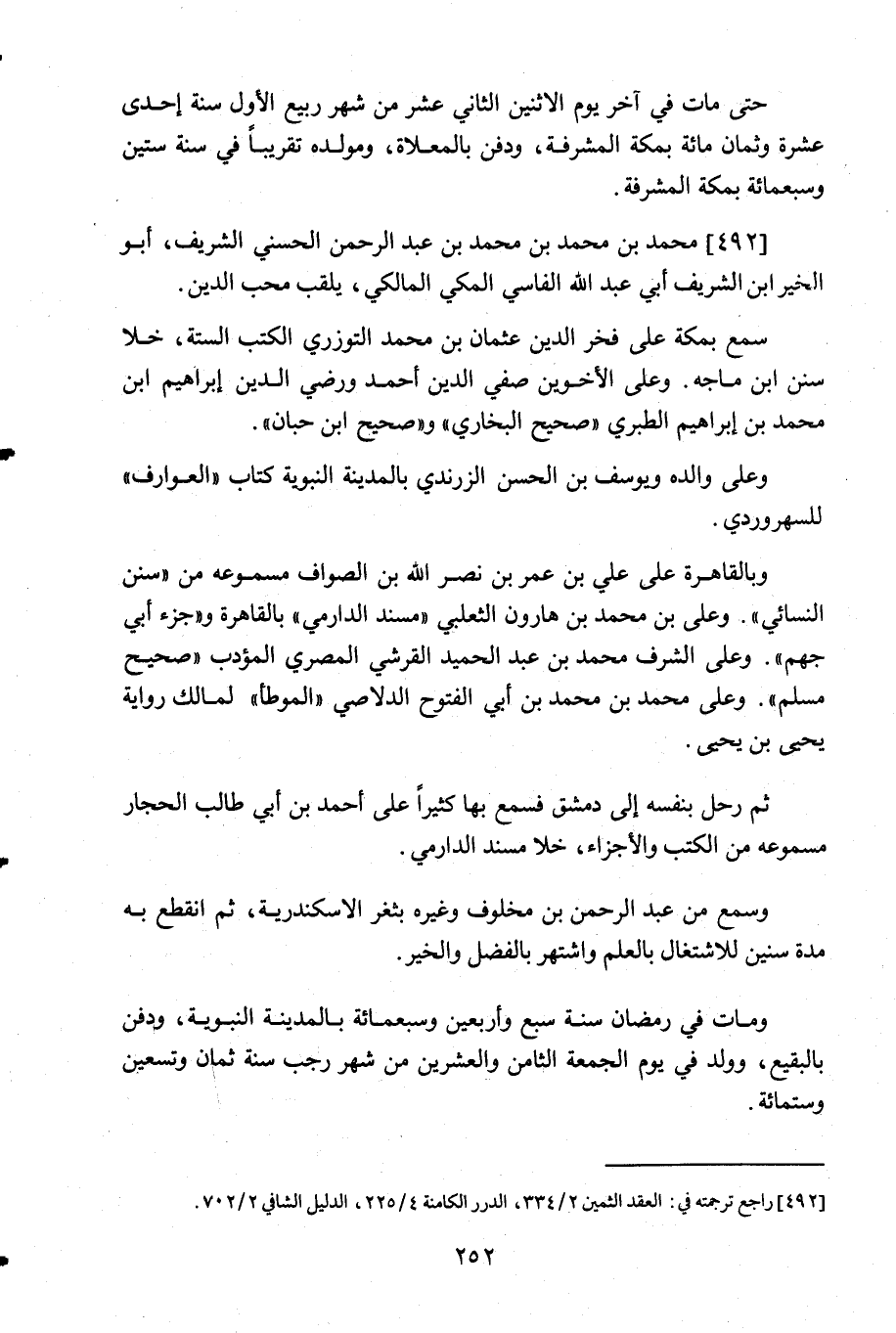 492 محمد بن محمد بن محمد بن عبد الرحمن الحس الشريف أبو الخير ابن الشريف أبي عبد الله الفاسي المكي المالكي يلقب محب الدين.