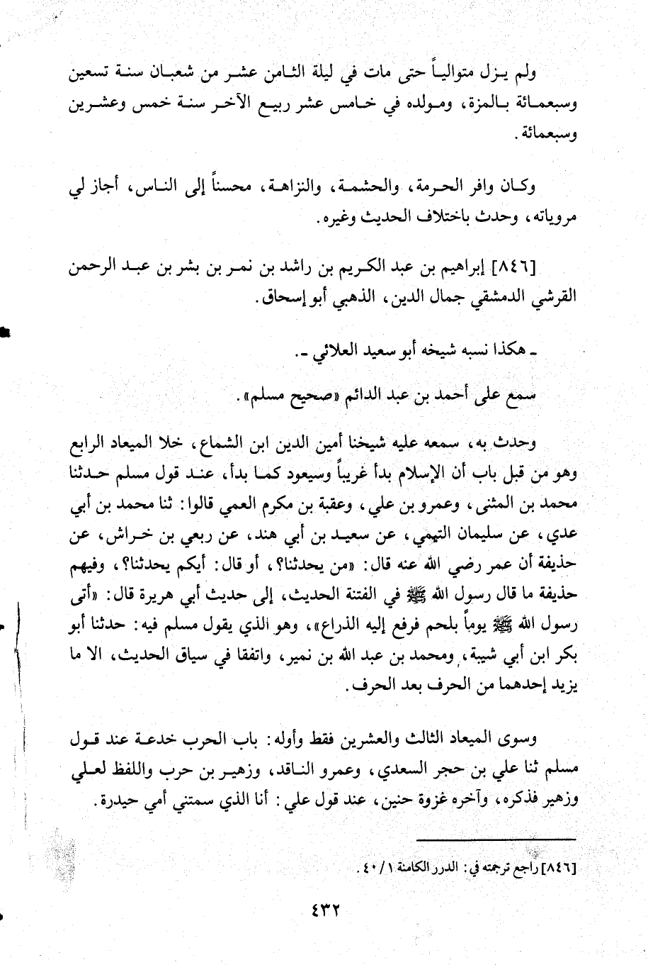 وحدث به سمعه عليه شيخنا أمين الدين ابن الشماع خلا الميعاد الرابع وهو من قبل باب أن الاسلام بدأ غريبا وسيعود كما بدأ وعند قول مسلم حدثنا محمد بن المثني وعمرو بن علي وعقبة بن مكرم العمي قالوا ثنا محمد بن أبي عدي عن سليمان التيمي عن سعيد بن أبي هند عن ربعي بن خراش عن حذيفة أن عمر رضي الله قال من يحدثنا أو قال أيكم يحدثنا وفيهم حذيفة ما قال رسول الله صَلَّى اللَّهُ عَلَيْهِ وَسَلَّمَ في الفتنة الحديث إلى حديث أبي هريرة قال أتى رسول الله - صلى الله عليه وسلم - يوما بلحم فرفع إليه الذراع وهو الذي يقول مسلم فيه حدثنا أبو بكر ابن أبي شيبة ومحمد بن عبد الله بن نمير واتفقا في سياق الحديث الا ما يزيد أحدهما من الحرف بعد الحرف.
