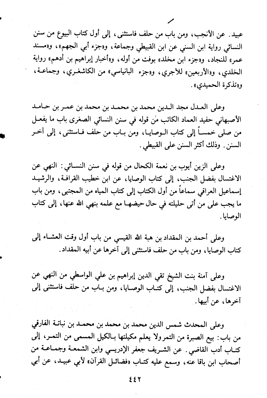 وعلى العدل مجد الدين محمد بن محمد بن عمر بن حامد الأصبهاني حفيد العماد الكاتب من قوله في سنن النسائي الصغرى باب ما يفعل من صلى خمسا إلى كتاب الوصايا ومن باب من حلف فاستثنى إلى آخر السنن وذلك أكثر السنن على القبيطي.