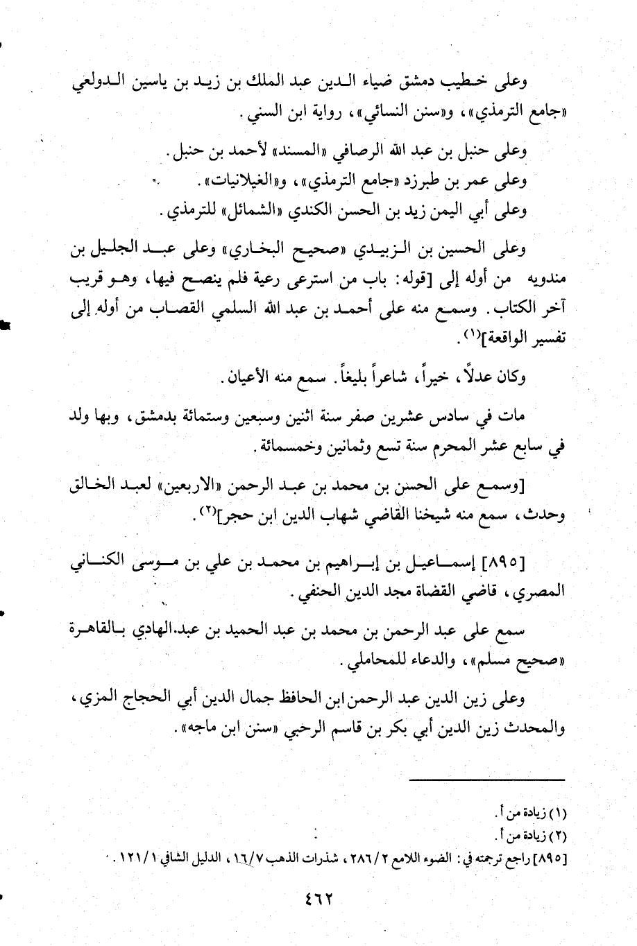 وعلى خطيب دمشق ضياء الدين عبد الملك بن زيد بن ياسين الدولعي جامع الترمذي وسنن النسائي رواية ابن السني.