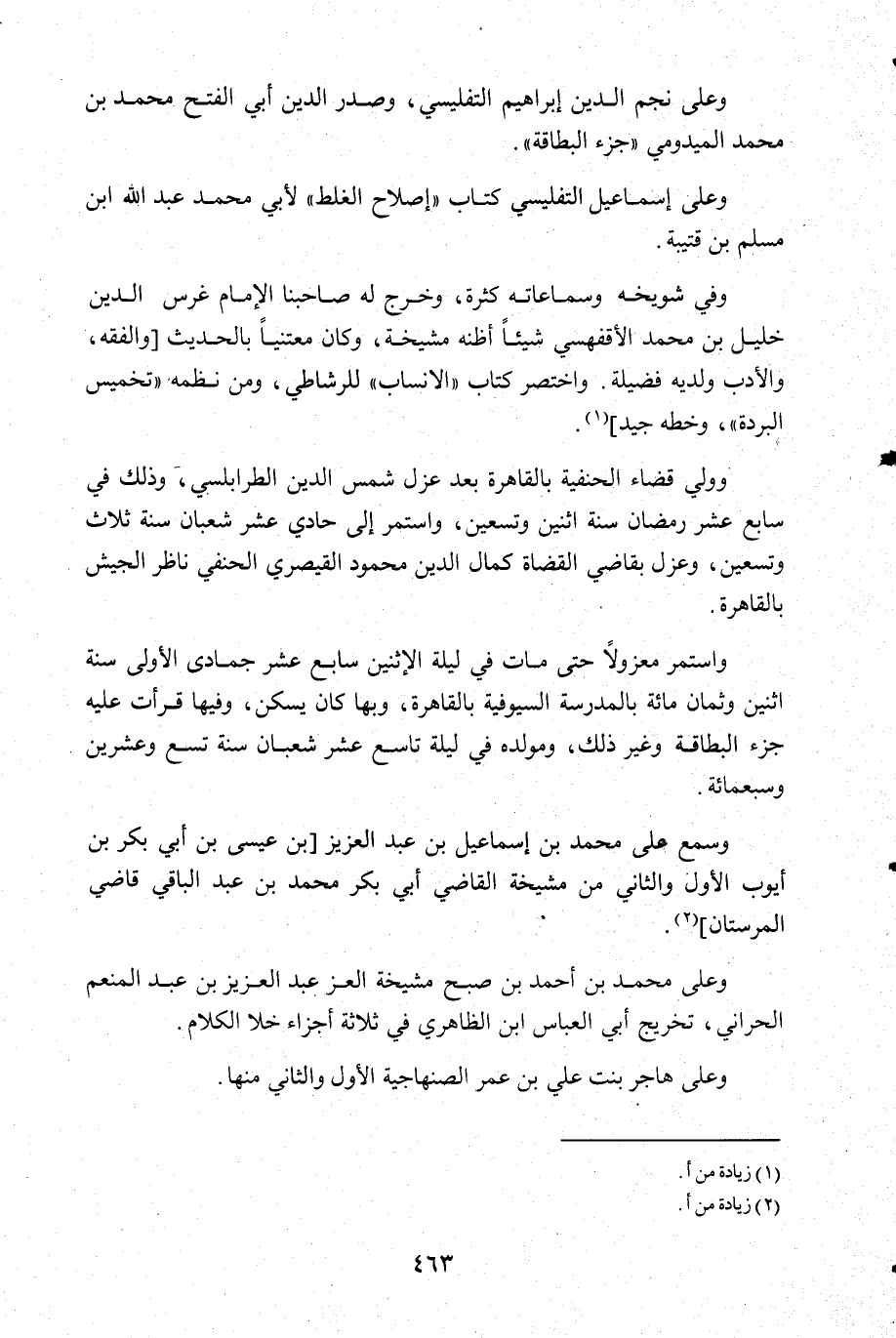 وفي شيوخه وسماعاته كثرة وخرج له صاحبنا الإمام غرس الدين خليل بن محمد الأقفهسي شيئا أظنه مشيخة وكان معتنيا الحديث [والفقه والأدب ولديه فضيلة واختصر كتاب الانساب للرشاطي ومن نظمه تخميس البردة وخطه جيد] 1.
