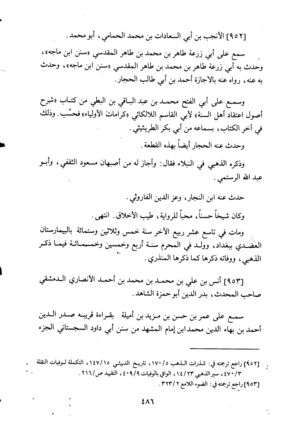 952- راجع ترجمته في: شذرات الذهب 5/170, تاريخ الدبيثي 15/147, التكملة لوفيات النقلة 3/470, سير الذهبي 23/14, الوافي بالوفيات 9/409, التقييد ص 216.
