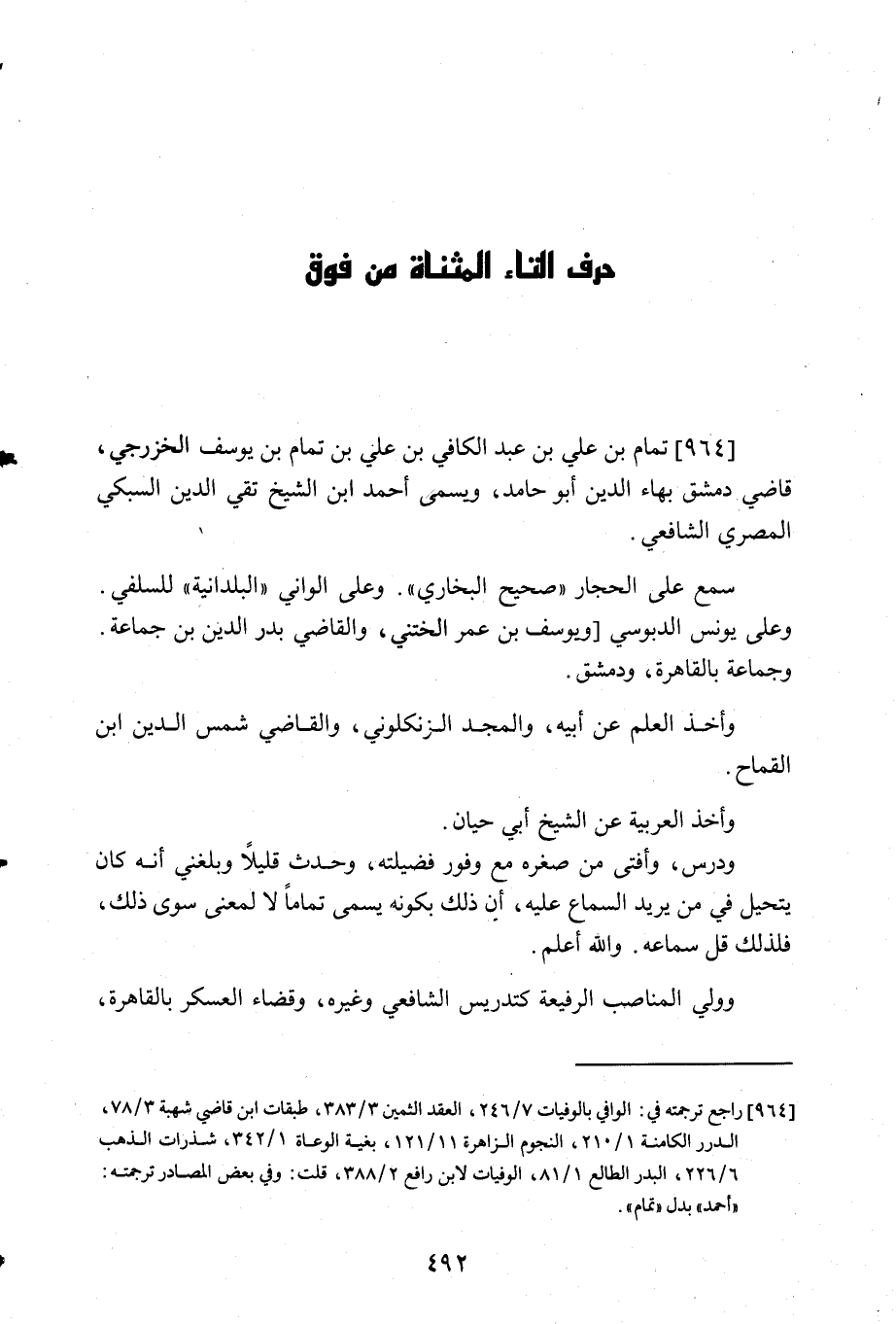 964- تمام بن علي بن عبد الكافي بن علي بن تمام بن يوسف الخززجي قاضي دمشق بهاء الدين ابو حامد ويسمى أحمد ابن الشيخ تقي الدين السبكي المصري الشافعي.