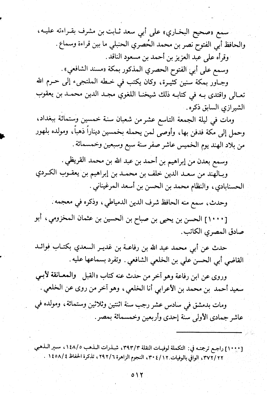 1000- راجع ترجمته في: التكملة لوفيات النقلة 3/393, شذرات الذهب 5/148 سير الذهبي 22/372, الوافي بالوفيات 12/304, النجوم الزاهرة 6/292, تذكرة الحفاظ 4/1458.