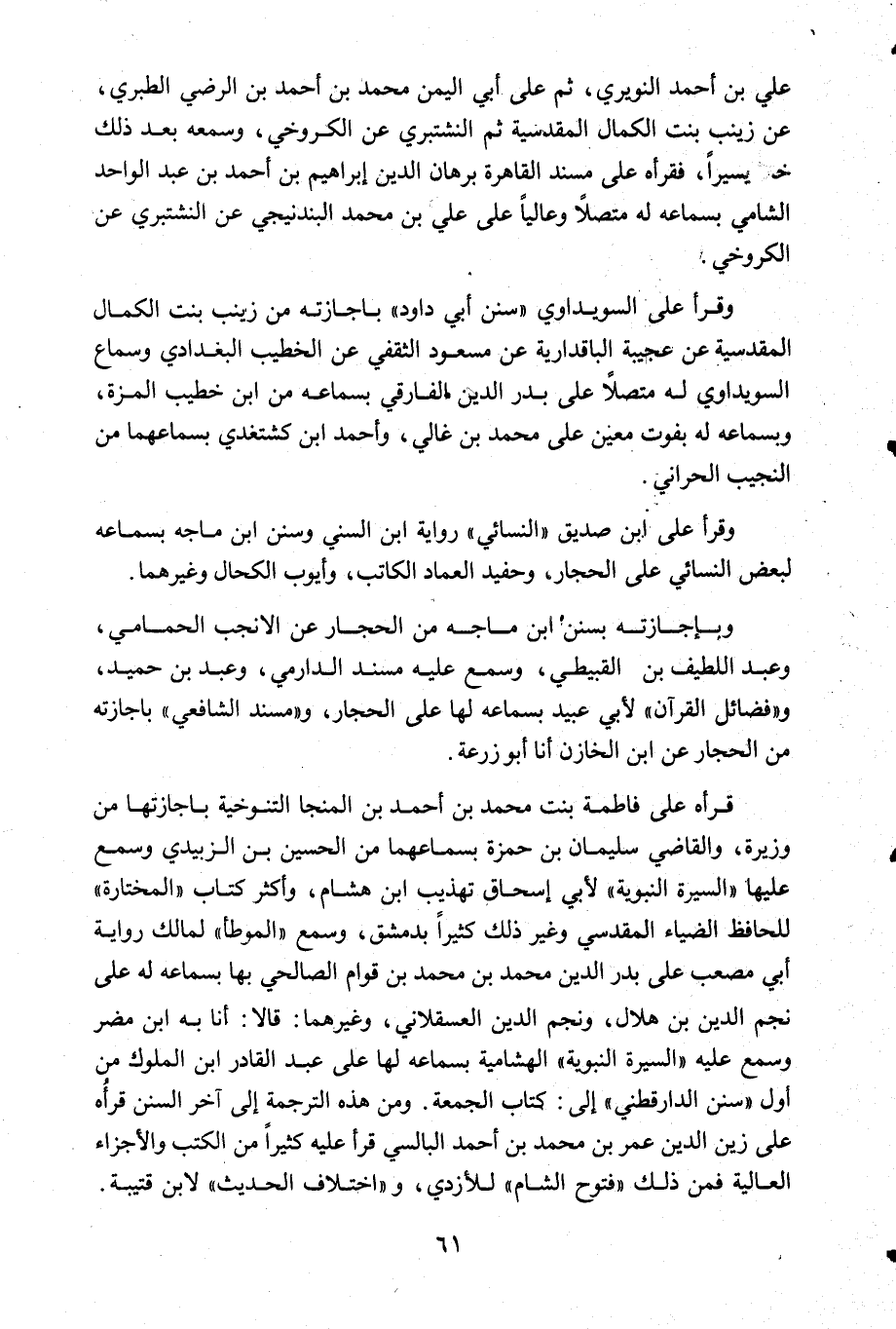 وقرأ على السويداوي سنن أبي داود باجازته من زينب بنت الكمال المقدسية عن عجبية الباقدارية عن مسعود الثقفي عن الخطيب البغدادي وسماع السويداوي له متصل على بدر الدين الفارقي بسماعه من ابن خطيب المزة وبسماعه له بفوت معين على محمدبن غالي وأحمد ابن كشتغدي بسماعهما من النجيب الحراني.