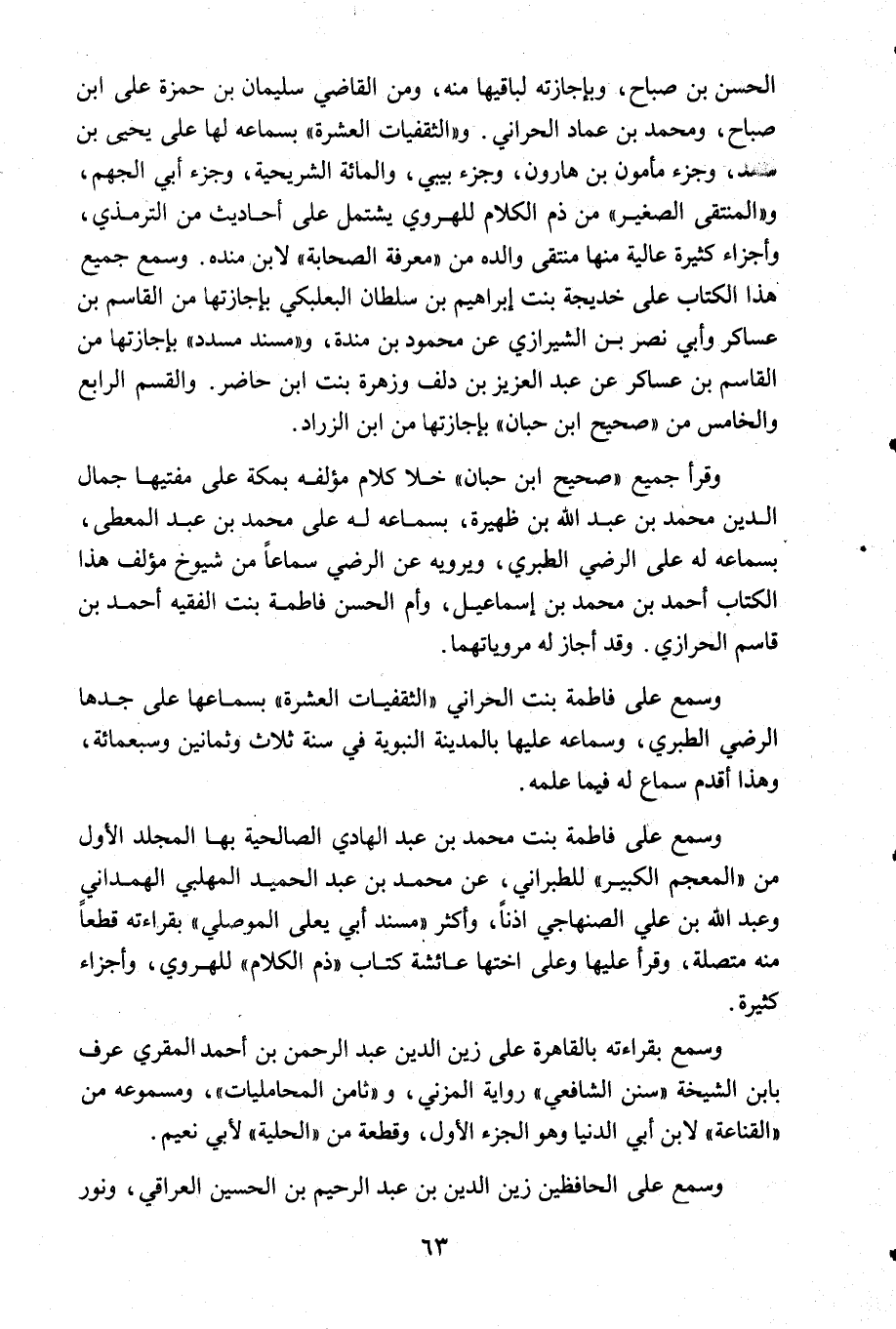 الحسن بن صباح وبإجازته لباقيها منه ومن القاضي سليمان بن حمزة على ابن صباح ومحمد بن عماد الحراني والثقفيات العشرة بسماعه لها على يحيى بن وجزء مأمون بن هارون وجزء بيبي والمائة الشريحية وجزء أبي الجهم والمنتقى الصغير من ذم الكلام اللهروي يشتمل على أحاديث من الترمذي وأجزاء كثيرة عالية منها منتقى والده من معرفة الصحابة لابن منده وسمع جميع هذا الكتاب على خديجة بنت ابراهيم بن سلطان البعلبكي بإجازتها من القاسم بت عساكر وأبي نصر بن الشيرازي عن محمود بن مندة ومسند مسدد بإجازتها من القاسم بن عساكر عن عبد العزيز بن دلف وزهرة بنت ابن حاضر والقسم الرابع والخامس من صحيح ابن حبان بإجازته من ابن الزراد.