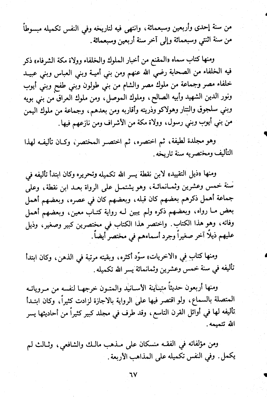 وهومجلدة لطيفه ثم اختصره ثم اختصرالمختصر وكان تأليفه لهذا التأليف ومختصريه سنة تاريخه. ومنها ذيل التقييد لابن نقطة يسر الله تكميله وتحريره وكان ابتدا تأليفه يف سنة خمس وعشرين وثمانمائة وهو يشتمل على الرواة بعد ابن نقطة وعلى جماعة أهمل ذكرهم بعضهم كان قبله وبعضهم كان في عصره وبعضهم أهمل بعض ما رواه وبعضهم ذكره ولم يبين لهم رواية كتاب معين وبعضهم أهمل وفاته وهو هذا الكتاب واختصر هذا الكتاب في مختصرين كبير وصغير وذيل عليهم ذيلا آخر صغيرا وجرد اسماءهم في مختصر أيضا.