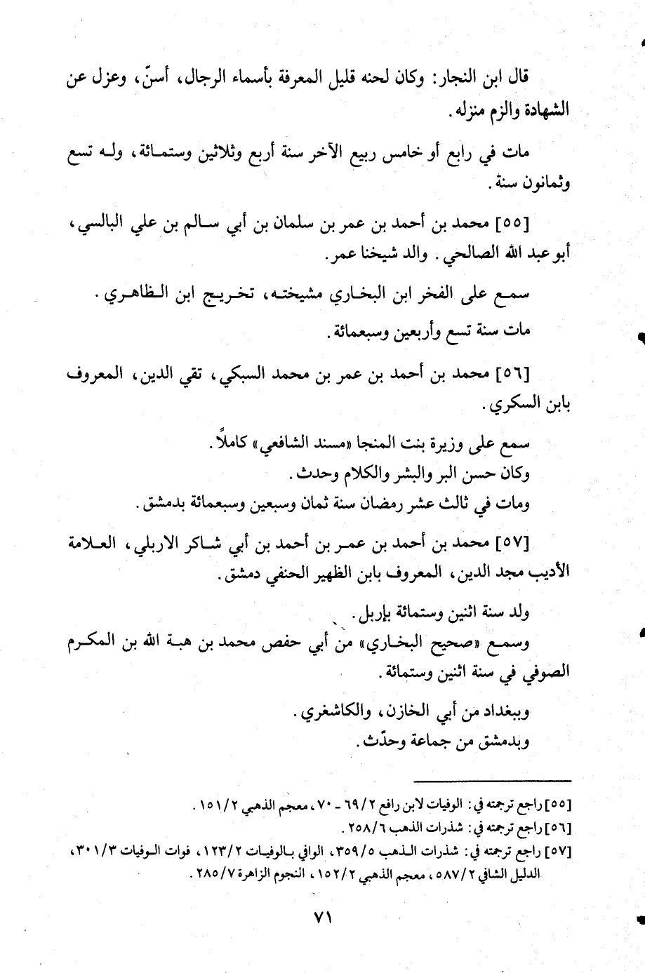 57- راجع ترجمته في: شذرات الذهب 5/359, الوافي بالوفيات 2/123, فوات الوفيات 3/301, الدليل الشافي 2/587, معجم الذهبي 2/152, النجوم الزاهرة 7/285.
