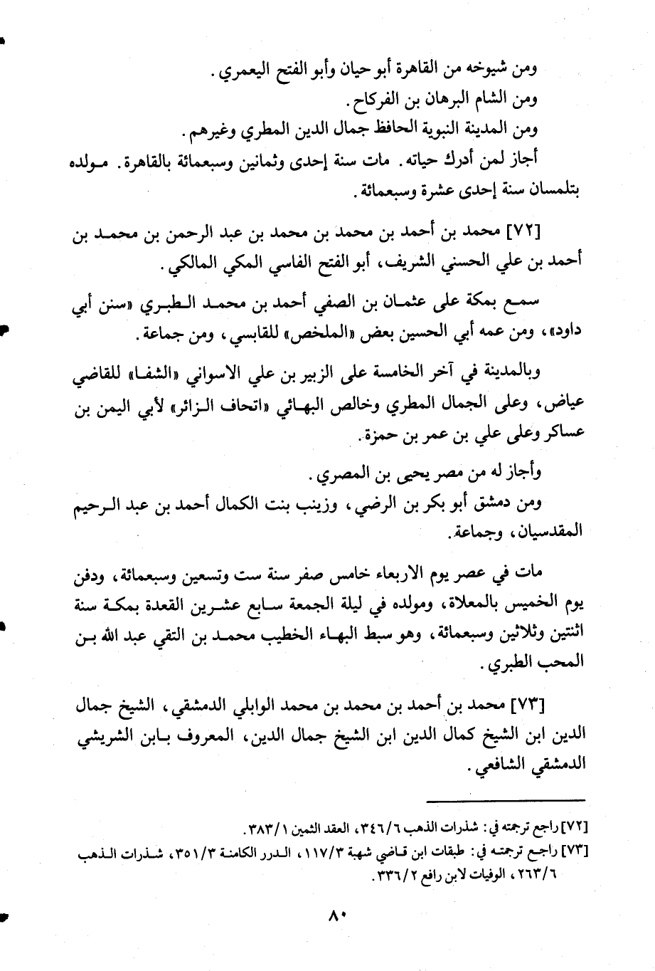 73- راجع ترجمته في: طبقات ابن قاضي شهبة 3/117, الدرر الكامنة 3/351, شذرات الذهب 6/263, الوفيات لابن رافع 2/336.