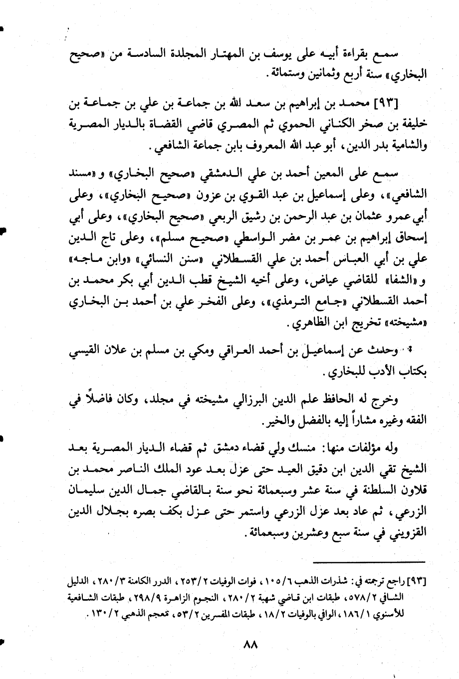 93- محمد بن أبرهيم بن سعد بن جماعة بن علي بن جماعة بن خليفة بن صخر الكناني الحموي ثم المصري قاضي القضاة بالديار المصرية والشامية بدر الدين أبو عبد الله المعروف بابن جماعة الشافعي.