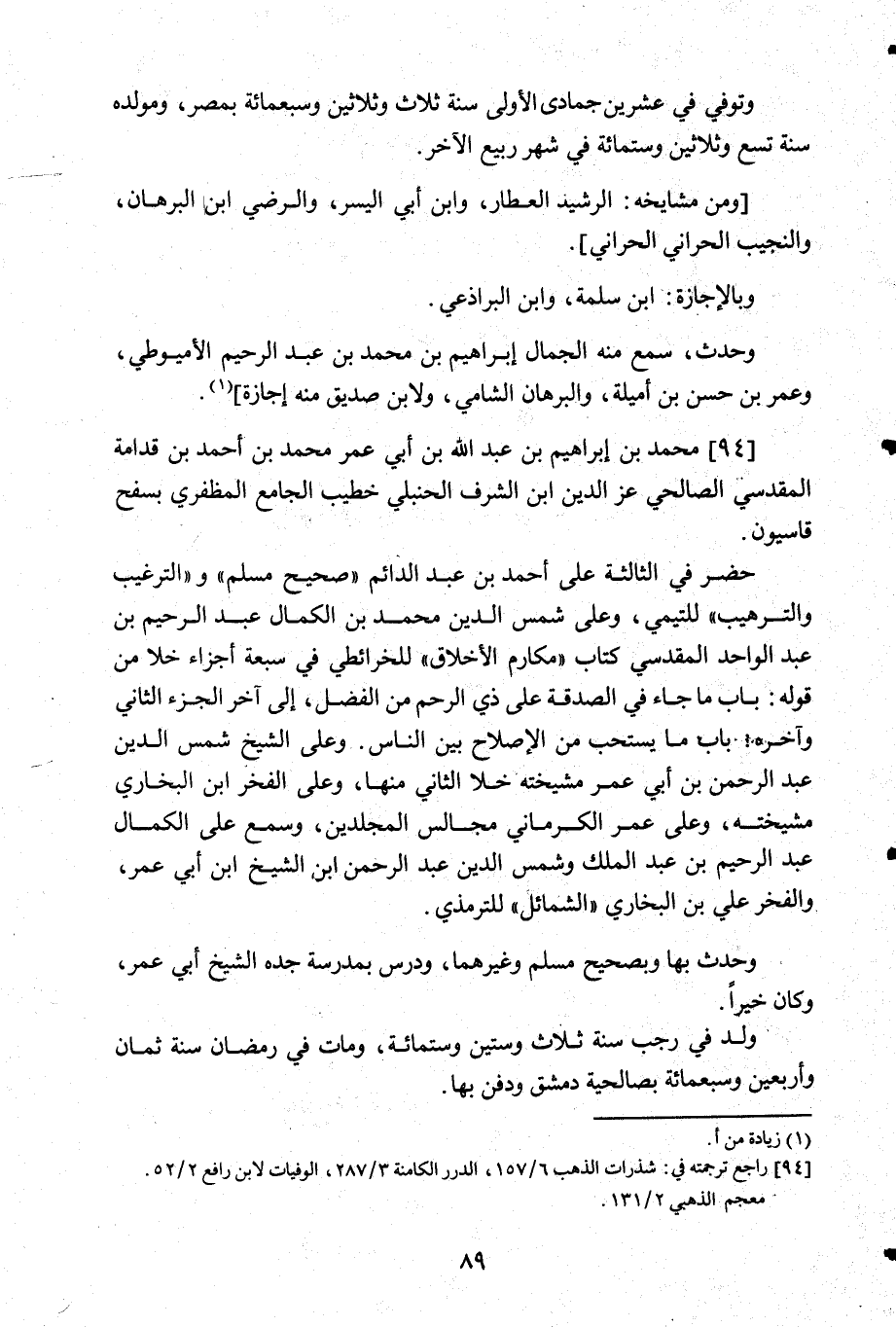 94- راجع ترجمته في: شذرات الذهب 6/157, الدرر الكامنة 3/287, الوفيات لابن رافع 2/52. معجم الذهبي 2/131.