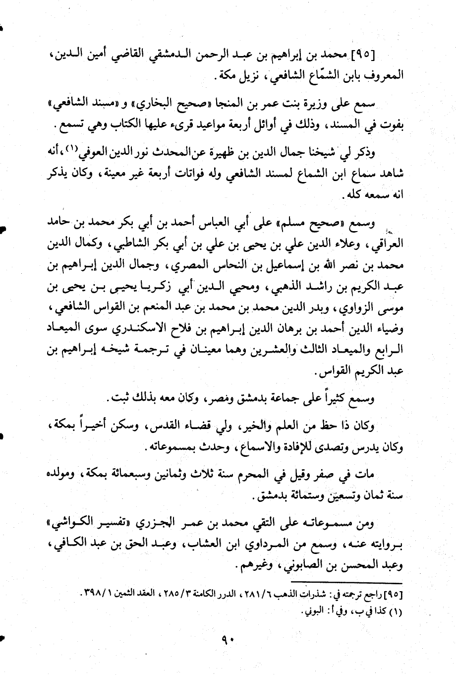 95- محمد بن ابراهيم بن عبد الرحمن الدمشقي القاضي أمين الدين المعروف بابن الشماع الشافعي نزيل مكة.