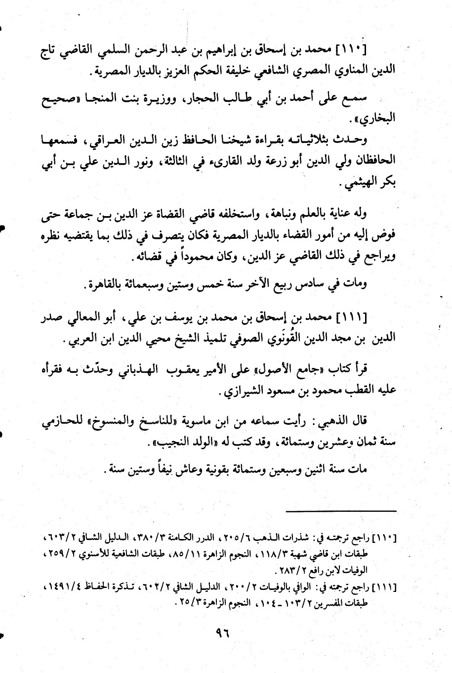 110- راجع ترجمته في: شذرات الذهب 6/205, الدرر الكامنة 3/380, الدليل الشافي 2/603,طبقات ابن قاضي شهبة 3/118, النجوم الزاهرة 11/85, طبقات الشافعية للأسنوي 2/259, الوفيات لابن رافع 2/283.