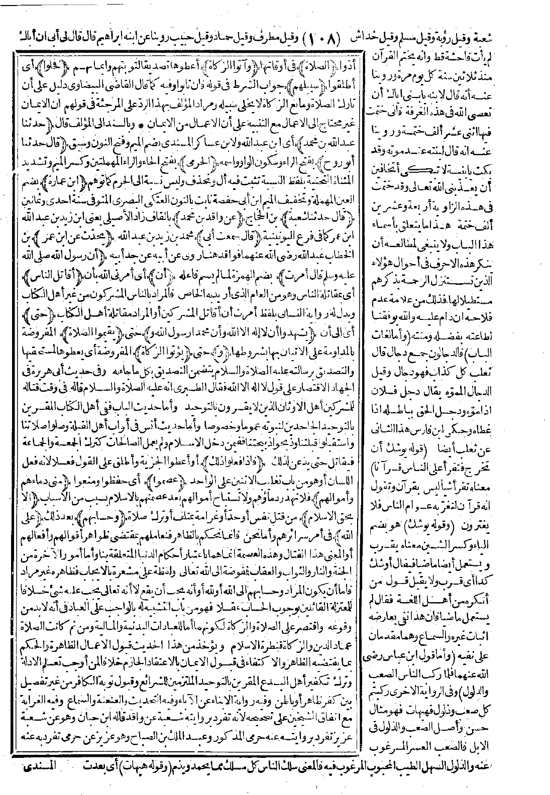 (أمرت) بضم الهمزة لما لم يسمّ فاعله (أن) أي أمرني الله بأن (أقاتل الناس) أي بمقاتلة الناس وهو من العام الذي أريد به الخاص، فالمراد بالناس المشركون من غير أهل الكتاب، ويدل له رواية النسائي بلفظ: أمرت أن أقاتل المشركين أو المراد مقاتلة أهل الكتاب. (حتى) أي إلى أن (يشهدوا أن لا إله إلا الله وأن محمدًا رسول الله، و) حتى (يقيموا الصلاة) المفروضة بالمداومة على الإتيان بها بشروطها، (و) حتى (يؤتوا الزكاة) المفروضة أي يعطوها لمستحقيها. والتصديق برسالته عليه الصلاة والسلام يتضمن التصديق بكل ما جاء به، وفي حديث أبي هريرة في الجهاد الاقتصار على قوله لا إله إلا الله: فقال الطبري: إنه عليه الصلاة والسلام قاله في وقت قتاله للمشركين أهل الأوثان الذين لا يقرون بالتوحيد، وأما حديث الباب ففي أما الكتاب المقرّين بالتوحيد الجاحدين لنبوّته عمومًا وخصوصًا. وأما حدث أنس في أبواب أهل القبلة: وصلوا صلاتنا واستقبلوا قبلتنا وذبحوا ذبيحتنا فيمن دخل الإسلام ولم يعمل الصالحات كترك الجمعة والجماعة فيقاتل حتى يذعن لذلك، (فإذا فعلوا ذلك) أو أعطوا الجزية، وأطلق على القول فعلاً لأنه فعل اللسان أو هو من باب تغليب الاثنين على الواحد، (عصموا) أي حفظوا ومنعوا (مني دماءهم وأموالهم)، فلا تهدر دماؤهم ولا تستباح أموالهم بعد عصمتهم بالإسلام بسبب من الأسباب، (إلاّ بحق الإسلام) من قتل نفس أو حدّ أو غرامة بمتلف أو ترك صلاة، (وحسابهم) بعد ذلك (على الله) في أمر سرائرهم، وأما نحن فإنما نحكم بالظاهر فنعاملهم بمقتضى ظواهر أقوالهم وأفعالهم، أو المعنى هذا القتال وهذه العصمة إنما هما باعتبار أحكام الدنيا المتعلقة بنا، وأما أمور الآخرة من الجنة والنار والثواب والعقاب فمفوّض إلى