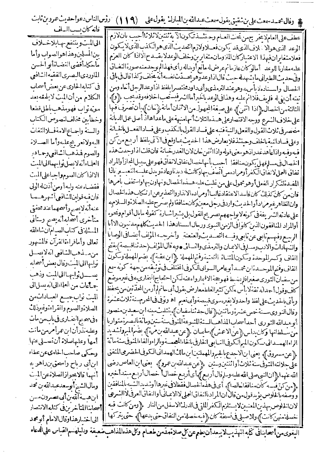 عطف على العامّ لا يخرج من تحت العامّ وحينئذ تكون الآية اثنتين لا ثلاثًا. أجيب: بأن لازم الوعد الذي هو الإخلاف الذي قد يكون فعلاً ولازم التحديث الذي هو الكذب الذي لا يكون فعلاً متغايرًا فبهذا الاعتبار كان الملزومان متغايران وخلف الوعد لا يقدح إلا إذا كان العزم عليه مقارنًا للوعد، أما لو كان عازمًا ثم عرض له مانع أو بدا له رأي فهذا لم يوجد منه صورة النفاق. وفي حديث الطبراني ما يشهد له حيث قال: إذا وعد وهو يحدّث نفسه أنه يخلف، وكذا قال في باقي الخصال. وإسناده لا بأس به وهو عند الترمذي وأبي داود مختصرًا بلفظ: إذا وعد الرجل أخاه ومن نيّته أن يَفِي له فلم يَفِ فلا إثم عليه وهذا في الوعد بالخير، أما الشر فيستحب إخلافه وقد يجب.