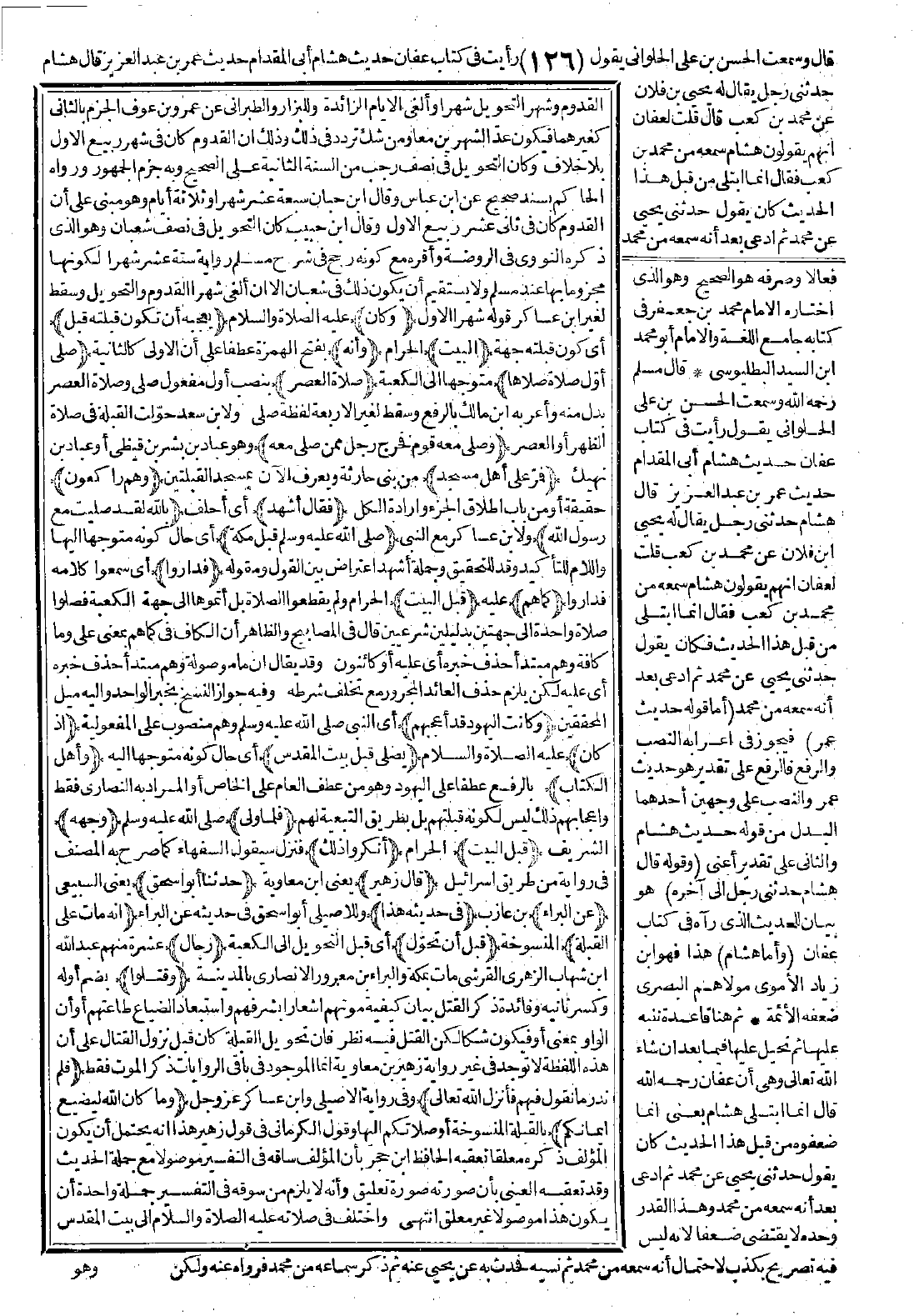 القدوم وشهر التحويل شهرًا، وألغى الأيام الزائدة. وللبزار والطبراني عن عمرو بن عوف الجزم بالثاني كغيرهما، فيكون عدّ الشهرين معًا ومن شك تردد في ذلك أن القدوم كان في شهر ربيع الأول بلا خلاف وكان التحويل في نصف رجب من السنة الثانية على الصحيح وبه جزم الجمهور. ورواه الحاكم بسند صحيح عن ابن عباس. وقال ابن حبان: سبعة عشر شهرًا وثلاثة أيام وهو مبني على أن القدوم كان في ثاني عشر ربيع الأول. وقال ابن حبيب: كان التحويل في نصف شعبان وهو الذي ذكره النووي في الروضة وأقره مع كونه رجح في شرح مسلم رواية ستة عشر شهرًا لكونها مجزومًا بها عند مسلم ولا يستقيم أن يكون ذلك في شعبان إلا إن ألغى شهرًا القدوم والتحويل وسقط لغير ابن عساكر قوله شهرًا الأول (وكان) عليه الصلاة والسلام (يعجبه أن تكون قبلته قبل) أي كون قبلته جهة (البيت) الحرام (وأنه) بفتح الهمزة عطفًا على أن الأولى كالثانية (صلى أول صلاة صلاها) متوجهًا إلى الكعبة (صلاة العصر) بنصب أول مفعول صلى وصلاة العصر بدل منه وأعربه ابن مالك بالرفع وسقط لغير الأربعة لفظة صلى، ولابن سعد حوّلت القبلة في صلاة الظهر أو العصر (وصلى معه قوم فخرج رجل ممن صلى معه) وهو عباد بن بشر بن قيظي أو عباد بن نهيك (فمرّ على أهل المسجد) من بني حارثة ويعرف الآن بمسجد القبلتين (وهم راكعون) حقيقة أو من باب إطلاق الجزء وإرادة الكل (فقال أشهد) أي أحلف (بالله لقد صلّيت مع رسول الله) ولابن عساكر مع النبي (-صَلَّى اللَّهُ عَلَيْهِ وَسَلَّمَ- قبل مكة) أي حال كونه متوجهًا إليها واللام للتأكيد وقد للتحقيق، وجملة أشهد اعتراض بين القول ومقوله (فداروا) أي سمعوا كلامه فداروا (كما هم) عليه (قبل البيت) الحرام ولم يقطعوا الصلاة بل أتموها إلى جهة الكعبة فصلوا صلاة واحدة إلى جهتين بدليلين شرعيين. قال في المصابيح: والظاهر أن الكاف في كما هم بمعنى على وما كافة وهم مبتدأ حذف خبره أي عليه أو كائنون، وقد يقال: إن ما