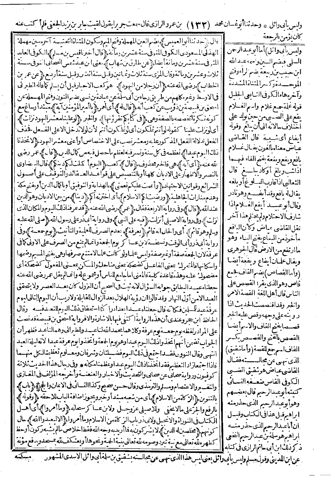 قال: (حدّثنا أبو العميس) بضم العين المهملة وفتح الميم وسكون المثناة التحتية آخره سين مهملة الهذلي المسعودي الكوفي المتوفى سنة عشرين ومائة قال: (أخبرنا قيس بن مسلم) الكوفي العابد المتوفى سنة عشرين ومائة أيضًا (عن طارق بن شهاب) يعني ابن عبد شمس الصحابي المتوفى سنة ثلاث وعشرين ومائة. وقال المزي: سنة ثلاث وثمانين، وقيل سنة اثنتين وقيل سنة أربع (عن عمر بن الخطاب) رضي الله عنه.