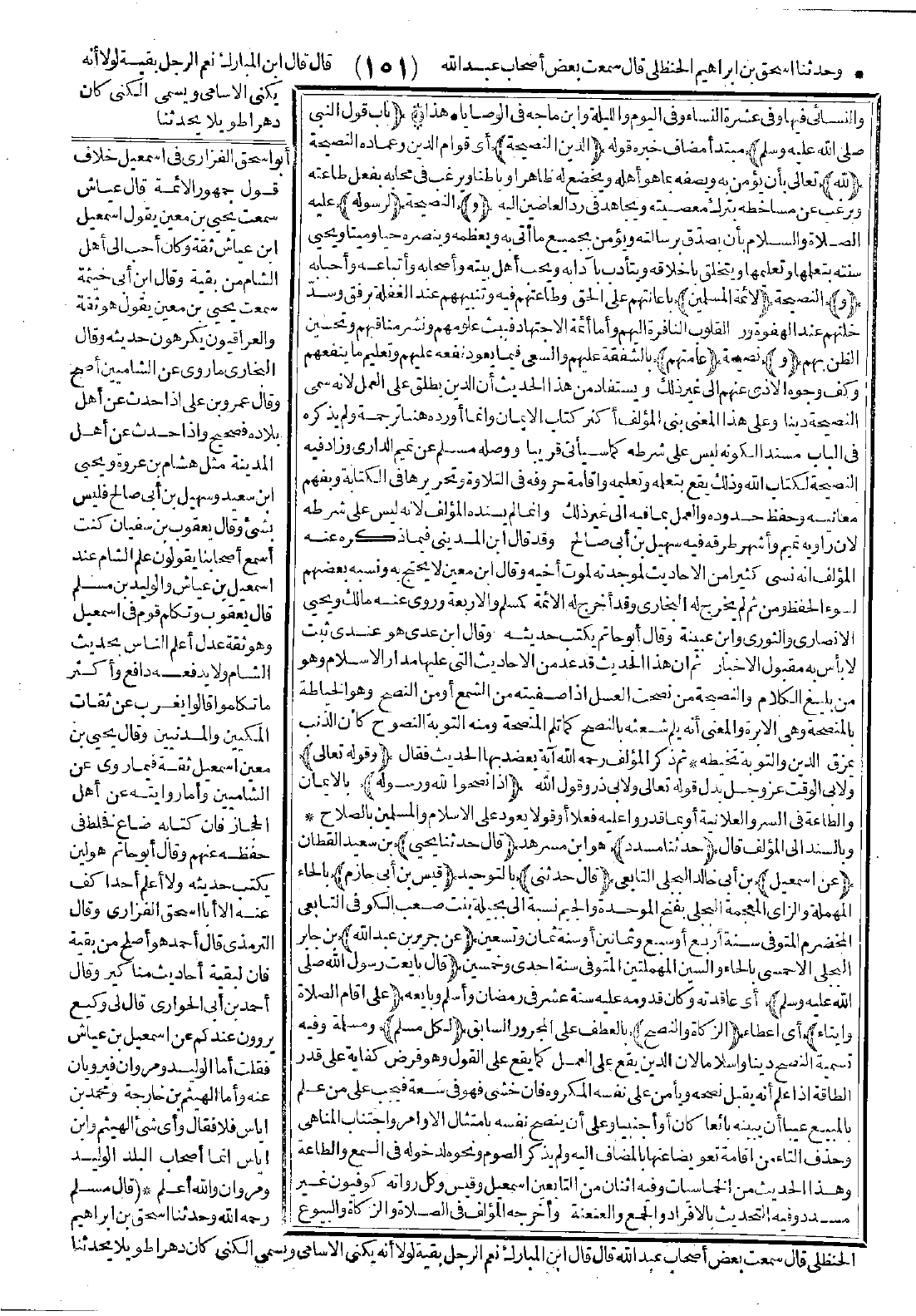 وزاد فيه: النصيحة لكتاب الله وذلك يقع بتعلمه وتعليمه وإقامة حروفه في التلاوة وتحريرها في الكتابة وبفهم معانيه وحفظ حدوده والعمل بما فيه إلى غير ذلك، وإنما لم يسنده المؤلف لأنه ليس على شرطه لأن راويه تميم، وأشهر طرقه فيه سهيل بن أبي صالح، وقد قال ابن المديني فيما ذكره عنه المؤلف أنه نسي كثيرًا من الأحاديث لموجدته لموت أخيه. وقال ابن معين: لا يحتج به، ونسبه بعضهم لسوء الحفظ، ومن ثم لم يخرج له البخاري، وقد أخرج له الأئمة كمسلم والأربعة. وروى عنه مالك ويحيى الأنصاري والثوري وابن عيينة. وقال أبو حاتم: يكتب حديثه. وقال ابن عديّ: هو عندي ثبت لا بأس به مقبول الأخبار، ثم إن هذا الحديث قد عدّ من الأحاديث التي عليها مدار الإسلام وهو من بليغ الكلام والنصيحة من نصحت العسل إذا صفّيته من الشمع أو من النصح وهو الخياطة بالمنصحة وهي الإبرة، والمعنى أنه يلم شعثه بالنصح كما تلم المنصحة ومنه التوبة النصوح كأن الذنب يمزق الدين والتوبة تخيطه.