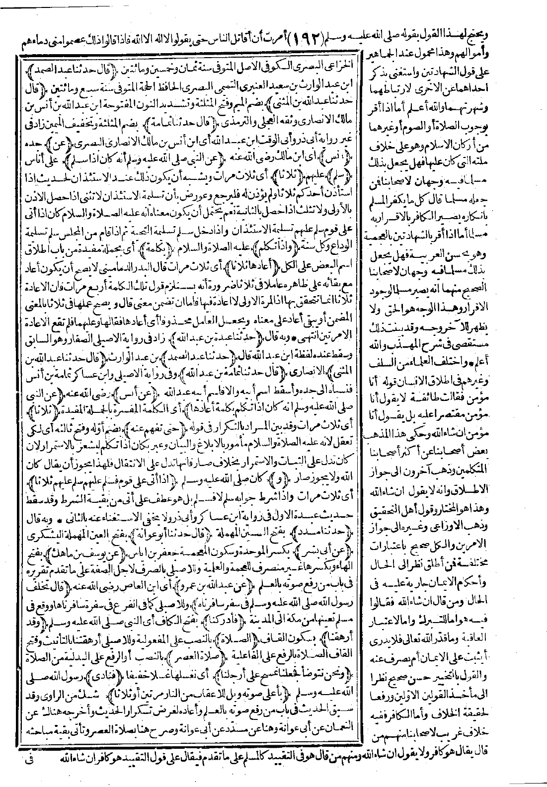 وبه قال (حدّثنا عبدة بن عبد الله) زاد في رواية الأصيلي الصفار وهو السابق وسقط عنده لفظة ابن عبد الله (قال حدّثنا عبد الصمد) بن عبد الوارث (قال حدّثنا عبد الله بن المثنى) الأنصاري (قال حدّثنا ثمامة بن عبد الله) وفي رواية الأصيلي وابن عساكر ثمامة بن أن فنسباه إلى جدّه وأسقطا اسم أبيه وإلا فاسم أبيه عبد الله (عن أنس) رضي الله عنه (عن النبي -صَلَّى اللَّهُ عَلَيْهِ وَسَلَّمَ- أنه كان إذا تكلم بكلمة أعادها) أي الكلمة المفسرة بالجملة المفيدة (ثلاثًا) أي ثلاث مرات وقد بيّن المراد بالتكرار في قوله (حتى تفهم عنه) بضم أوّله وفتح ثالثه أي لكي تعقل لأنه عليه الصلاة والسلام مأمور بالإبلاغ والبيان وعبر بكان إذا تكلم ليشعر بالاستمرار لأن كان تدل على الثبات والاستمرار بخلاف صار فإنها تدل على الانتقال فلهذا يجوز أن يقال كان الله ولا يجوز صار (و) كان -صَلَّى اللَّهُ عَلَيْهِ وَسَلَّمَ- (إذا أتى على قوم سلم عليهم سلم عليهم ثلاثًا) أي ثلاث مرات إذا شرط جوابه سلم لا فسلم بل هو عطف على أتى من بقية الشرط وقد سقط حديث عبدة الأول في رواية ابن عساكر وأبي ذر ولا يخفى الاستغناء