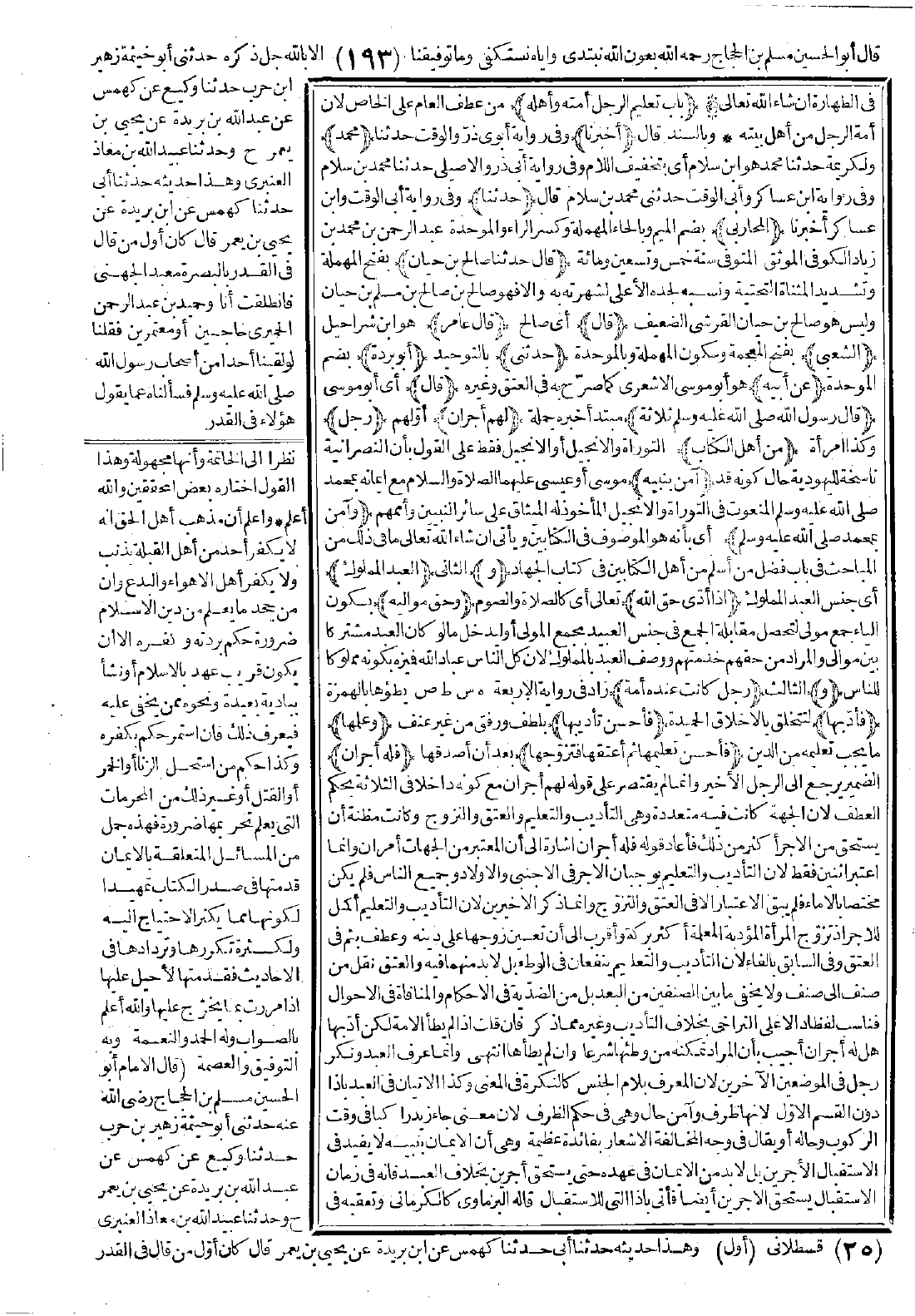 97 - أَخْبَرَنَا مُحَمَّدٌ -هُوَ ابْنُ سَلاَمٍ- قال: حَدَّثَنَا الْمُحَارِبِيُّ قَالَ: حَدَّثَنَا صَالِحُ بْنُ حَيَّانَ قَالَ: قَالَ عَامِرٌ الشَّعْبِيُّ حَدَّثَنِي أَبُو بُرْدَةَ عَنْ أَبِيهِ قَالَ: قَالَ رَسُولُ اللَّهِ -صَلَّى اللَّهُ عَلَيْهِ وَسَلَّمَ-: «ثَلاَثَةٌ لَهُمْ أَجْرَانِ: رَجُلٌ مِنْ أَهْلِ الْكِتَابِ آمَنَ بِنَبِيِّهِ، وَآمَنَ بِمُحَمَّدٍ -صَلَّى اللَّهُ عَلَيْهِ وَسَلَّمَ- وَالْعَبْدُ الْمَمْلُوكُ إِذَا أَدَّى حَقَّ اللَّهِ وَحَقَّ مَوَالِيهِ، وَرَجُلٌ كَانَتْ عِنْدَهُ أَمَةٌ فَأَدَّبَهَا فَأَحْسَنَ تَأْدِيبَهَا، وَعَلَّمَهَا فَأَحْسَنَ تَعْلِيمَهَا، ثُمَّ أَعْتَقَهَا فَتَزَوَّجَهَا، فَلَهُ أَجْرَانِ».
