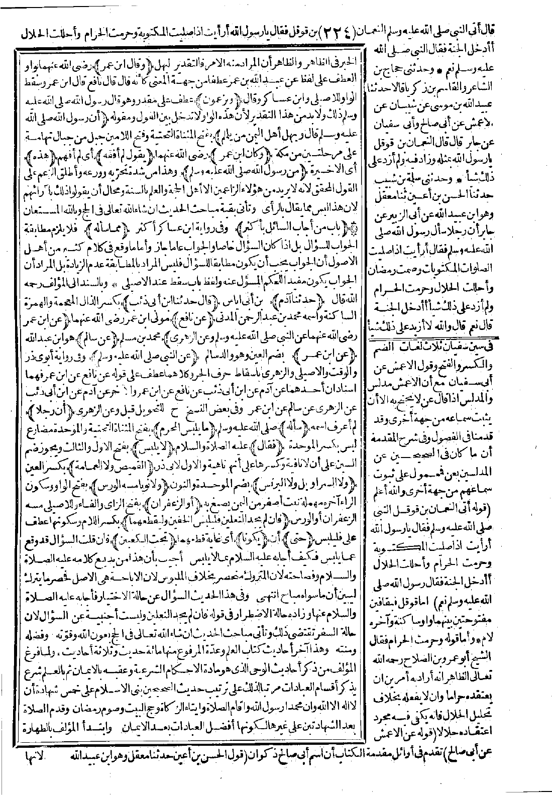 وبالسند إلى المؤلف رحمه الله قال: (حدّثنا آدم) بن أبي إياس (قال: حدّثنا ابن أبي ذئب) بكسر الذال المعجمة والهمزة الساكنة واسمه محمد بن عبد الرحمن المدني (عن نافع) مولى ابن عمر رضي الله عنهما (عن ابن عمر) رضي الله عنهما، (عن النبي -صَلَّى اللَّهُ عَلَيْهِ وَسَلَّمَ-. وعن الزهري) محمد بن مسلم (عن سالم) هو ابن عبد الله (عن ابن عمر) بضم العين وهو والد سالم (عن النبي-صَلَّى اللَّهُ عَلَيْهِ وَسَلَّمَ-) وفي رواية أبوي ذر والوقت والأصيلي والزهري بإسقاط حرف الجر وكلاهما عطف على قوله عن نافع عن ابن عمر فهما إسنادان أحدهما عن آدم عن ابن أبي ذئب عن نافع عن ابن عمر، والآخر عن آدم عن ابن أبي ذئب عن الزهري عن سالم عن ابن عمر، وفي بعض النسخ ح للتحويل قبل، وعن الزهري: