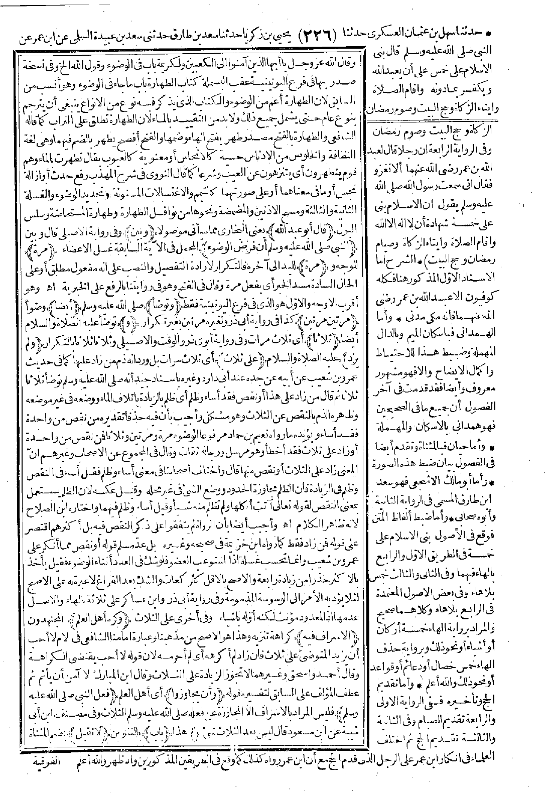 (وكره أهل العلم) المجتهدون (الإسراف فيه) كراهة تنزيه وهذا هو الأصح من مذهبنا وعبارة إمامنا الشافعي في الأم: لا أحب أن يزيد المتوضئ على ثلاث، فإن زاد لم أكرهه أي لم أحرمه لأنه قوله: لا أحب يقتضي الكراهة. وقال أحمد وإسحاق وغيرهما: لا تجوز الزيادة على الثلاث، وقال ابن المبارك: لا آمن أن يأثم. ثم عطف المؤلف على السابق لتفسيره قوله (وأن يجاوزوا) أي أهل العلم (فعل النبي -صَلَّى اللَّهُ عَلَيْهِ وَسَلَّمَ-)، فليس المراد بالإسراف إلا المجاوزة عن فعله -صَلَّى اللَّهُ عَلَيْهِ وَسَلَّمَ- الثلاث، وفي مصنف ابن أبي شيبة عن ابن مسعود قال: ليس بعد الثلاث شيء.