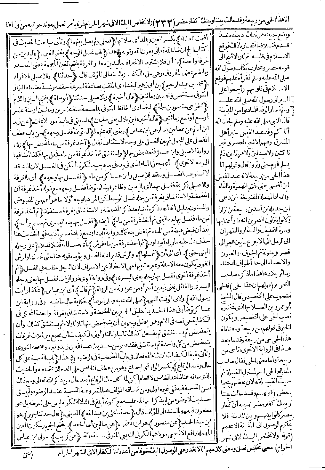 (أخبرنا ابن بلال يعني سليمان) السابق في باب أمور الإيمان (عن زيد بن أسلم عن عطاء بن يسار عن ابن عباس) رضي الله عنهما (أنه توضأ فغسل وجهه) من باب عطف المفصل على المجمل ثم بين الغسل على وجه الاستئناف فقال: (أخذ غرفة من ماء فمضمض بها) وفي رواية الأصيلى وابن عساكر فتمضمض بها (واستنشق ثم أخذ غرفة من ماء فجعل بها هكذا أضافها إلى يده الأخرى) أي جعل الماء الذي في يده في يديه جميعًا لكونه أمكن في الغسل لأن اليد قد لا تستوعب الغسل وسقط للأصيلي وابن عساكر من ماء (فغسل بها وجهه) أي بالغرفة وللأصيلي وكريمة فغسل بهما أي باليدين وظاهر قوله: إنه توضأ فغسل وجهه مع قوله أخذ غرفة أن المضمضة، والاستنشاق بغرفة من جملة غسل الوجه، لكن المراد بالوجه أوّلاً ما هو أعمّ من المفروض والمسنون بدليل أنه أعاد ذكره ثانيًا بعد ذكر المضمضة والاستنشاق بغرفة مستقلة. (ثم أخذ غرفة من ماء فغسل بها يده اليمنى، ثم أخذ غرفة من ماء) أيضًا (فغسل بها يده اليسرى ثم مسح برأسه) بعد أن قبض قبضة من الماء ثم نفض يده كما في رواية أبي داود مع زيادة مسح أُذنيه ففي الحديث هنا حذف دلّ عليه ما رواه أبو داود. (ثم أخذ غرفة من ماء فرش) أي صب الماء قليلاً قليلاً (على رجله اليمنى حتى) أي إلى أن (غسلها) والرش قد يراد به الغسل، ويؤيد قوله هنا حتى غسلها والرش القوي يكون معه الإسالة وعبّر به تنبيهًا على الاحتراز عن الإسراف لأن الرجل مظنته في الغسل (ثم أخذ غرفة أخرى فغسل بها رجله يعني اليسرى) وفي رواية أبوي ذر والوقت فغسل بها يعني رجله اليسرى والقائل يعني زيد بن أسلم أو من هو دونه من الرواة. (ثم قال) أي ابن عباس (هكذا رأيت رسول الله) ولأبي الوقت النبي (-صَلَّى اللَّهُ عَلَيْهِ وَسَلَّمَ- يتوضأ) حكاية حال ماضية، وفي رواية ابن عساكر توضأ، وفي هذا الحديث دليل الجمع بين المضمضة والاستنشاق بغرفة واحدة المحكي في الكفاية عن نصه في الأم، وهو يحتمل وجهين أن يتمضمض منها ثلاثًا ولاء ثم يستنشق كذلك، وأن يتمضمض ثم يستنشق ثم يفعل كذلك ثانيًا وثالثًا، وأولى الكيفيات أن يجمع بين ثلاث غرفات يتمضمض من كل واحدة ثم يستنشق، فقد صح من حديث عبد الله بن زيد وغيره وصححه النووي وتأتي بقية الكيفيات إن شاء الله تعالى في باب المضمضة في الوضوء.