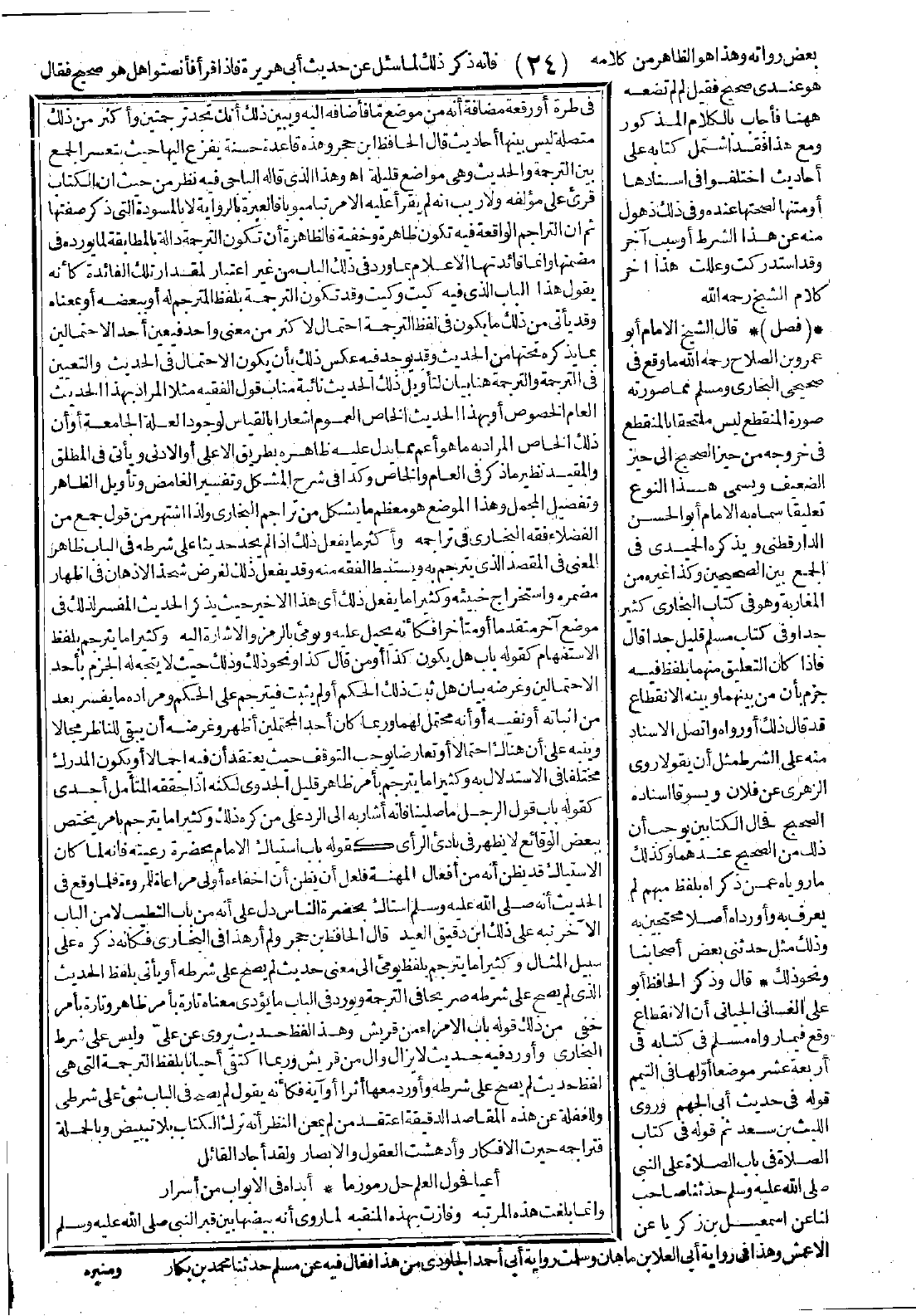 حسنة يفزع إليها بحيث يتعسر الجمع بين الترجمة والحديث وهي مواضع قليلة اهـ. وهذا الذي قاله الباجي فيه نظر من حيث أن الكتاب قرىء على مؤلفه، ولا ريب أنه لم يقرأ عليه إلا مرتبًا مبوّبًا، فالعبرة بالرواية لا بالمسودّة التي ذكر صفتها، ثم إن التراجم الواقعة فيه تكون ظاهرة وخفية، فالظاهرة أن تكون الترجمة دالّة بالمطابقة لما يورده فى مضمنها، وإنما فائدتها الإعلام بما ورد في ذلك الباب من غير اعتبار لمقدار تلك الفائدة، كأنه يقول هذا الباب الذي فيه كيت وكيت. وقد تكون الترجمة بلفظ المترجم له أو ببعضه أو بمعناه، وقد يأتي من ذلك ما يكون في لفظ الترجمة احتمال لأكثر من معنى واحد فيعين أحد الاحتمالين بما يذكره تحتها من الحديث، وقد يوجد فيه عكس ذلك بأن يكون الاحتمال في الحديث والتعيين في الترجمة، والترجمة هنا بيان لتأويل ذلك الحديث نائبة مناب قول الفقيه، مثلاً المراد بهذا الحديث العام الخصوص أو بهذا الحديث الخاص العموم إشعارًا بالقياس لوجود العلة الجامعة، أو أن ذلك الخاص المراد به ما هو أعم مما يدل عليه ظاهره بطريق الأعلى أو الأدنى، ويأتي في المطلق والمقيد نظير ما ذكر في العام والخاص، وكذا في شرح المشكل وتفسير الغامض وتأويل الظاهر وتفصيل المجمل، وهذا الموضع هو معظم ما يشكل من تراجم البخاري، ولذا اشتهر من قول جمع من الفضلاء: فقه البخاري في تراجمه، وأكثر ما يفعل ذلك إذا لم يجد حديثًا على شرطه في الباب ظاهر المعنى في المقصد الذي يترجم به ويستنبط الفقه منه، وقد يفعل ذلك لغرض شحذ الأذهان في إظهار مضمره واستخراج خبيئه، وكثيرًا ما يفعل ذلك أي هذا الأخير حيث يذكر الحديث المفسر لذلك في موضع آخر متقدمًا أو متأخرًا، فكأنه يحيل عليه ويومىء بالرمز والإشارة إليه، وكثيرًا ما يترجم بلفظ الاستفهام كقوله: باب هل يكون كذا، أو من قال كذا ونحو ذلك. وذلك حيث لا يتجه له الجزم بأحد الاحتمالين، وغرضه بيان هل ثبت ذلك الحكم أو لم يثبت، فيترجم على الحكم ومراده ما يفسر بعد من إثباته أو نفيه، أو أنه محتمل لهما، وربما كان أحد المحتملين أظهر، وغرضه أن يبقي للناظر مجالاً وينبّه على أن هناك مجالاً أو تعارضًا يوجب التوقف حيث يعتقد أن فيه إجمالاً أو يكون المدرك مختلفًا في الاستدلال به، وكثيرًا ما يترجم بأمر ظاهر قليل الجدوى، لكنه إذا حقّقه المتأمل أجدى كقوله: باب قول الرجل ما صلينا. فإنه أشار به إلى الرد على من كره ذلك. وكثيرًا ما يترجم بأمر يختص ببعض الوقائع لا يظهر في بادىء الرأي كقوله: باب استياك الإمام بحضرة رعيته. فإنه لما كان الاستياك قد يظن أنه من أفعال المهنة، فلعل أن يظن أن إخفاءه أولى مراعاة للمروءة، فلما وقع في الحديث أنه -صَلَّى اللَّهُ عَلَيْهِ وَسَلَّمَ- استاك بحضرة الناس دل على أنه من باب التطيب لا من الباب الآخر، نبّه على ذلك ابن دقيق العيد، قال الحافظ ابن حجر: ولم أرَ هذا في البخاري، فكأنه ذكره على سبيل المثال. وكثيرًا ما يترجم بلفظ يومىء إلى معنى حديث لم يصح على شرطه أو يأتي بلفظ الحديث الذي لم يصح على شرطه صريحًا في الترجمة، ويورد في الباب ما يؤدي معناه بأمر ظاهر وتارة بأمر خفيّ، من ذلك قوله: باب الأمراء من قريش. وهذا لفظ حديث يروى عن عليّ وليس على شرط البخاري، وأورد فيه حديث لا يزال والٍ من قريش. وربما اكتفى أحيانًا بلفظ الترجمة التي هي لفظ حديث لم يصح على شرطه وأورد معها أثرًا أو آية، فكأنه يقول لم يصح