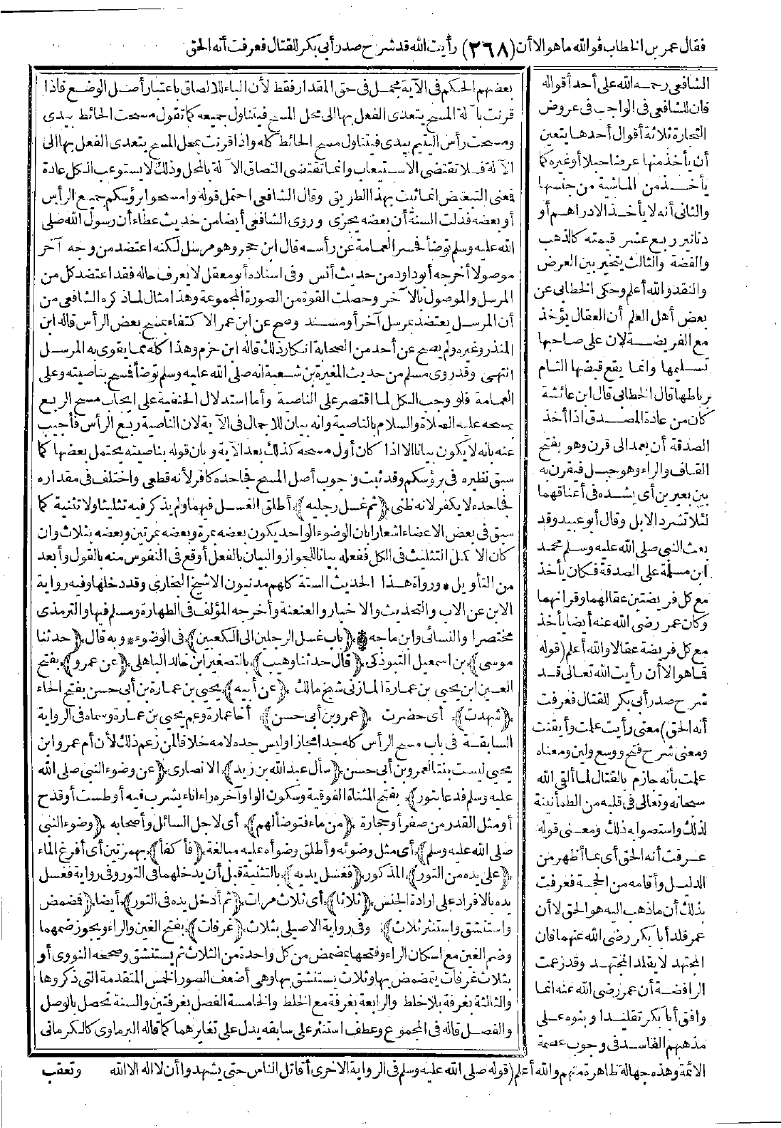 بعضهم: الحكم في الآية مجمل في حق المقدار فقط لأن الباء للإلصاق باعتبار أصل الوضع، فإذا قرنت بآلة المسح يتعدى الفعل بها إلى محل المسح فيتناول جميعه كما تقول: مسحت الحائط بيدي ومسحت رأس اليتيم بيدي فيتناول مسح الحائط كله، وإذا قرنت بمحل المسح يتعدى الفعل بها إلى الآلة فلا تقتضي الاستيعاب، وإنما تقتضي التصاق الآلة بالمحل وذلك لا يستوعب الكل عادة فمعنى التبعيض إنما ثبت بهذا الطريق. وقال الشافعي احتمل قوله: {وَامْسَحُوا بِرُءُوسِكُمْ} جميع الرأس أو بعضه، فدلّت السُّنّة أن بعضه يجزئ. وروى الشافعي أيضًا من حديث عطاء أن رسول الله -صَلَّى اللَّهُ عَلَيْهِ وَسَلَّمَ- توضأ فحسر العمامة عن رأسه قال ابن حجر: وهو مرسل لكنه اعتضد من وجه آخر موصولاً أخرجه أبو داود من حديث أنس، وفي إسناده أبو معقل لا يعرف حاله فقد اعتضد كلٌّ من المرسل والموصول بالآخر وحصلت القوة من الصورة المجموعة، وهذا مثال لا ذكره الشافعي من أن الرسل يعتضد بمرسل آخر أو مسند، وصح عن ابن عمر الاكتفاء بمسح بعض الرأس قاله ابن المنذر وغيره ولم يصح من أحد من الصحابة إنكار ذلك قاله ابن جزم، وهذا كله مما يقوى به المرسل انتهى.