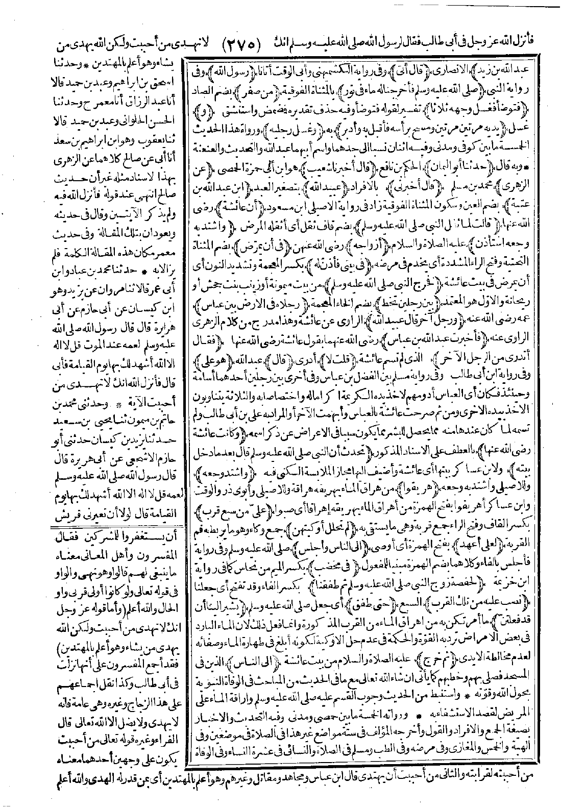 198 - حَدَّثَنَا أَبُو الْيَمَانِ قَالَ: أَخْبَرَنَا شُعَيْبٌ عَنِ الزُّهْرِيِّ قَالَ: أَخْبَرَنِي عُبَيْدُ اللَّهِ بْنُ عَبْدِ اللَّهِ بْنِ عُتْبَةَ أَنَّ عَائِشَةَ قَالَتْ: لَمَّا ثَقُلَ النَّبِيُّ -صَلَّى اللَّهُ عَلَيْهِ وَسَلَّمَ- وَاشْتَدَّ بِهِ وَجَعُهُ اسْتَأْذَنَ أَزْوَاجَهُ فِي أَنْ يُمَرَّضَ فِي بَيْتِي، فَأَذِنَّ لَهُ. فَخَرَجَ النَّبِيُّ -صَلَّى اللَّهُ عَلَيْهِ وَسَلَّمَ- بَيْنَ رَجُلَيْنِ تَخُطُّ رِجْلاَهُ فِي الأَرْضِ: بَيْنَ عَبَّاسٍ وَرَجُلٍ آخَرَ قَالَ عُبَيْدُ اللَّهِ: فَأَخْبَرْتُ عَبْدَ اللَّهِ بْنَ عَبَّاسٍ فَقَالَ: أَتَدْرِي مَنِ الرَّجُلُ الآخَرُ؟ قُلْتُ: لاَ. قَالَ: هُوَ عَلِيٌّ -وَكَانَتْ عَائِشَةُ -رضي الله عنها- تُحَدِّثُ أَنَّ النَّبِيَّ -صَلَّى اللَّهُ عَلَيْهِ وَسَلَّمَ- قَالَ بَعْدَ مَا دَخَلَ بَيْتَهُ وَاشْتَدَّ وَجَعُهُ: «هَرِيقُوا عَلَىَّ مِنْ سَبْعِ قِرَبٍ لَمْ تُحْلَلْ أَوْكِيَتُهُنَّ، لَعَلِّي أَعْهَدُ إِلَى النَّاسِ». وَأُجْلِسَ فِي مِخْضَبٍ لِحَفْصَةَ زَوْجِ النَّبِيِّ -صَلَّى اللَّهُ عَلَيْهِ وَسَلَّمَ-، ثُمَّ طَفِقْنَا نَصُبُّ عَلَيْهِ تِلْكَ القِرَبِ حَتَّى طَفِقَ يُشِيرُ إِلَيْنَا أَنْ قَدْ فَعَلْتُنَّ. ثُمَّ خَرَجَ إِلَى النَّاسِ. [الحديث 198 - أطرافه في: 664، 665، 679، 683، 687، 712، 713، 716، 2588، 3099، 3384، 4442، 4445، 5714، 7303].