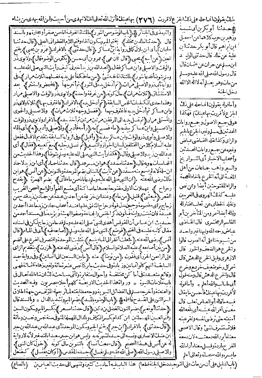 (كان عمي) عمرو بن أبي حسن (يكثر من الوضوء. قال) ولأبوي ذر والوقت والأصيلي وابن عساكر فقال (لعبد الله بن زيد: أخبرني كيف رأيت النبي -صَلَّى اللَّهُ عَلَيْهِ وَسَلَّمَ- يتوضأ. فدعا بتور) بالمثناة إناء فيه شيء (من ماء فكفأ على يديه فغسلهما ثلاث مرار) وفي رواية أبي ذر والأصيلي مرات. (ثم أدخل يده في التور) ثم أخرجها (فمضمض واستنثر) بعد الاستنشاق (ثلاث مرات) حال كونه (من غرفة واحدة) ولأبوي ذر والوقت والأصيلي مرار، وهذه إحدى الكيفيات الخمس السابقة، (ثم أدخل يده) بالإفراد (فاغترف بها) ثلاثًا، ولأبي ذر وابن عساكر: ثم أدخل يديه فاغترف بهما (فغسل وجهه ثلاث مرات) وللأصيلي والحموي والمستملي مرار (ثم غسل يديه إلى المرفقين مرتين مرتين ثم أخذ بيده) بالإفراد، ولأبوي ذر والوقت والأصيلي وابن عساكر بيديه (ماء فمسح به رأسه فأدبر) وللأصيلي وأدبر (به) أي بالماء، وللأصيلي وأبوي ذر والوقت وابن عساكر بيديه (وأقبل) وفي الرواية السابقة بتقديم الإقبال ففعل عليه السلام كلاًّ من المختلفين لبيان الجواز والتيسير، (ثم غسل رجليه) مع كعبيه (فقال) أي عبد الله بن زيد وللأصيلي وقال: (هكذا رأيت النبي -صَلَّى اللَّهُ عَلَيْهِ وَسَلَّمَ- يتوضأ) وهذا الحديث من الخماسيات.