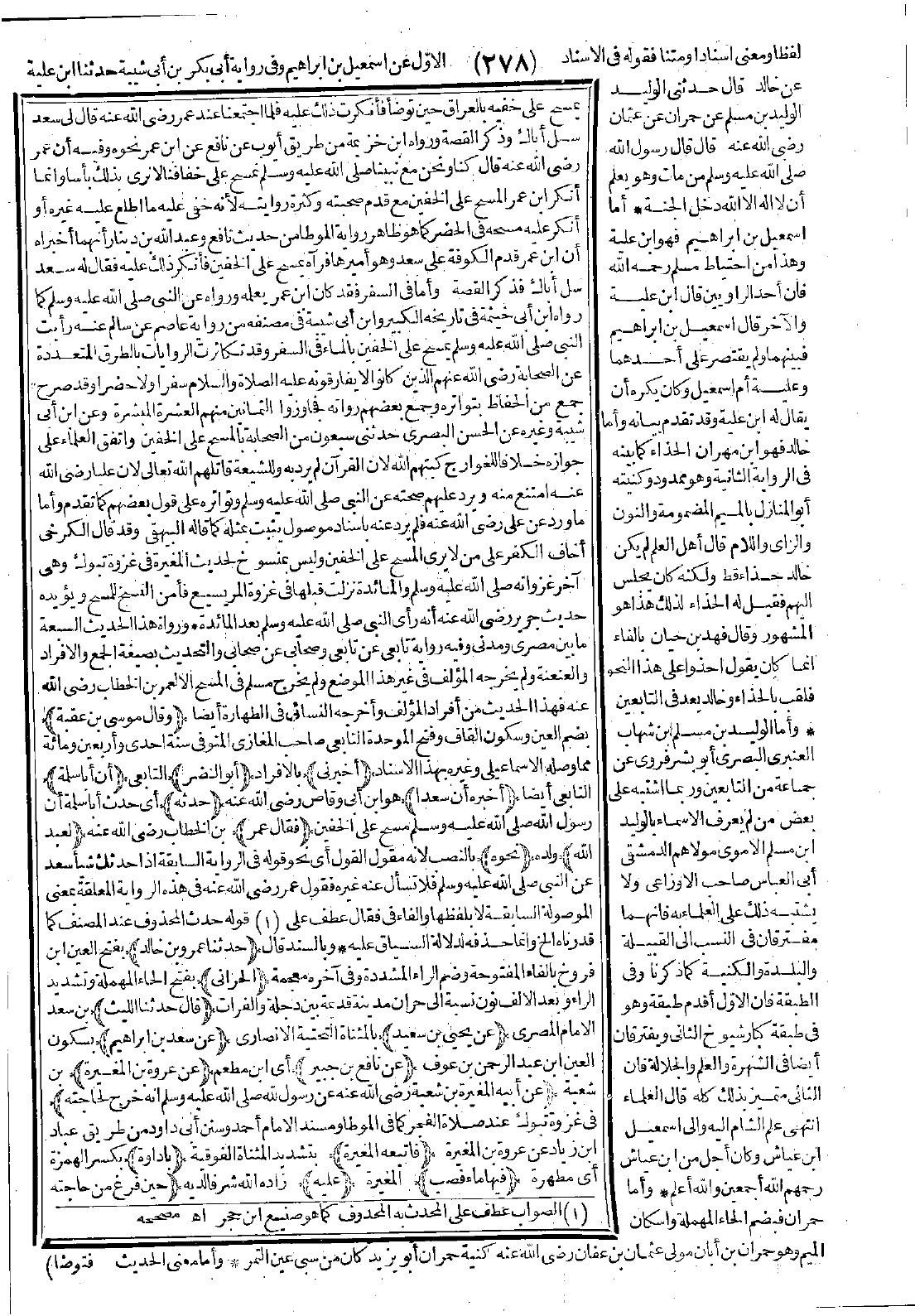 ورواه عن النبي -صَلَّى اللَّهُ عَلَيْهِ وَسَلَّمَ- كما رواه ابن أبي خيثمة في تاريخه الكبير، وابن أبي شيبة في مصنفه من رواية عاصم عن سالم عنه رأيت النبي -صَلَّى اللَّهُ عَلَيْهِ وَسَلَّمَ- يمسح على الخفّين بالماء في السفر، وقد تكاثرت الروايات بالطرق المتعددة عن الصحابة رضي الله عنهم الذين كانوا لا يفارقونه عليه الصلاة والسلام سفرًا ولا حضرًا، وقد صرح جمع من الحفاظ بتواتره وجمع بعضهم رواته فجاوزوا الثمانين منهم العشرة المبشرة