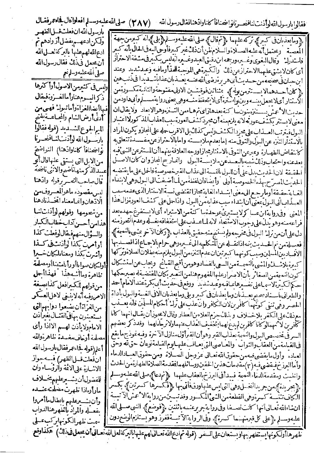 شديد، ووقع في حديث أبي بكرة عند الإمام أحمد والطبراني بإسناد صحيح يعذبان وما يعذبان في كبير وبلى وما يعذبان إلا في الغيبة، والبول بأداة الحصر وهي تنفي كونهما كافرين لأن الكافر وإن عذب على ترك أحكام المسلمين فإنه يعذب مع ذلك على الكفر بلا خلاف، وبذلك جزم العلاء بن العطار وقال: لا يجوز أن يقال إنهما كانا كافرين لأنهما لو كانا كافرين لم يدع لهما بتخفيف العذاب عنهما ولا ترجاه لهما، وقد ذكر بعضهم السرّ في تخصيص البول والنميمة بعذاب القبر، وهو أن القبر أوّل منازل الآخرة وفيه نموذج ما يقع في القيامة من العقاب والثواب والمعاصي التي يعاقب عليها يوم القيامة نوعان: حق لله وحق لعباده، وأوّل ما يقضى فيه من حقوق الله تعالى عز وجل الصلاة، ومن حقوق العباد الدماء، وأما البرزخ فيقضي فيه مقدمات هذين الحقين ووسائلهما، فمقدمة الصلاة الطهارة من الحدث والخبث ومقدمة الدماء النميمة فيبدأ في البرزخ بالعقاب عليهما.