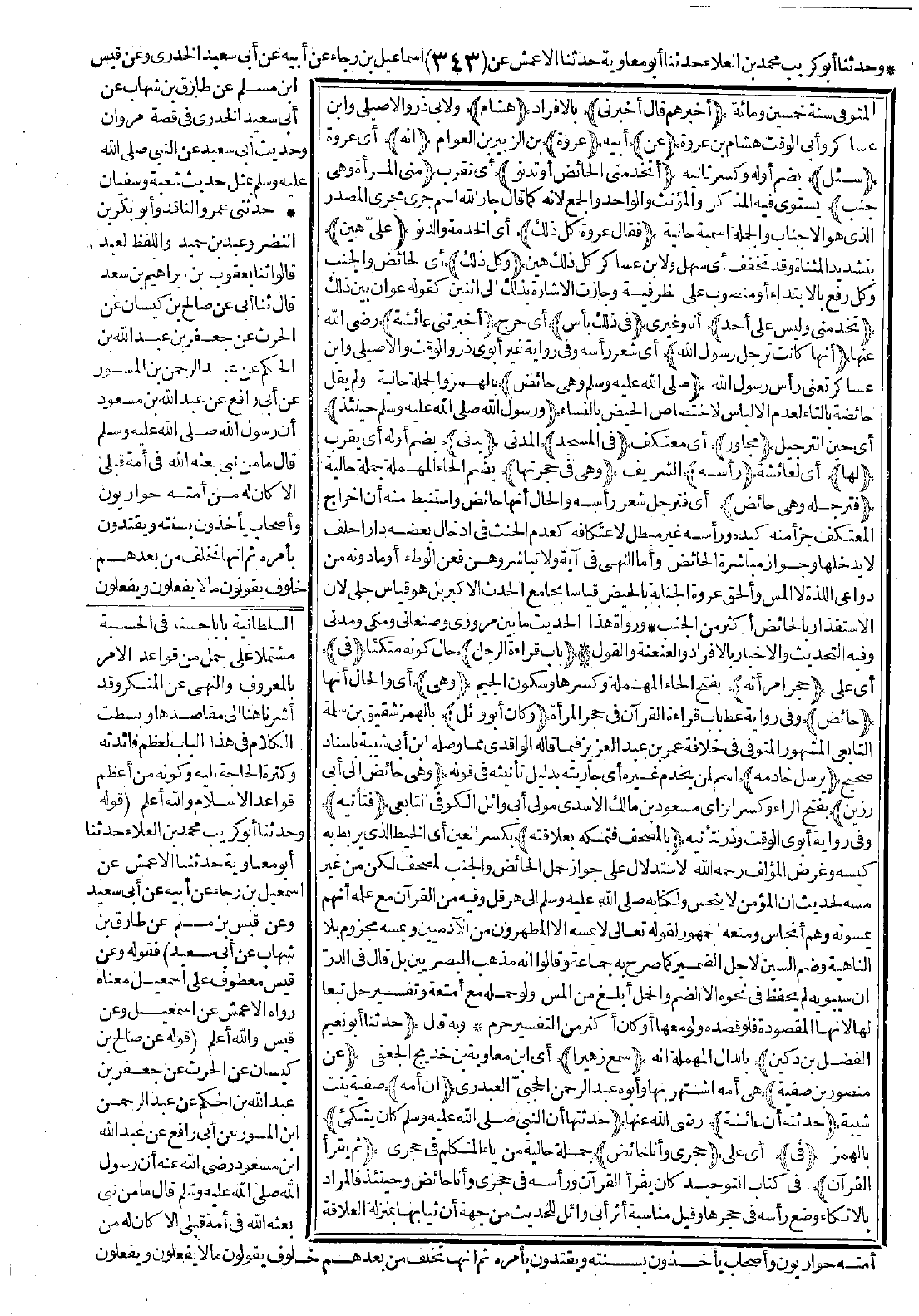 297 - حَدَّثَنَا أَبُو نُعَيْمٍ الْفَضْلُ بْنُ دُكَيْنٍ سَمِعَ زُهَيْرًا عَنْ مَنْصُورٍ ابْنِ صَفِيَّةَ أَنَّ أُمَّهُ حَدَّثَتْهُ أَنَّ عَائِشَةَ حَدَّثَتْهَا أَنَّ النَّبِيَّ -صَلَّى اللَّهُ عَلَيْهِ وَسَلَّمَ- كَانَ يَتَّكِئُ فِي حَجْرِي وَأَنَا حَائِضٌ ثُمَّ يَقْرَأُ الْقُرْآنَ. [الحديث 297 - طرفه في: 7549].